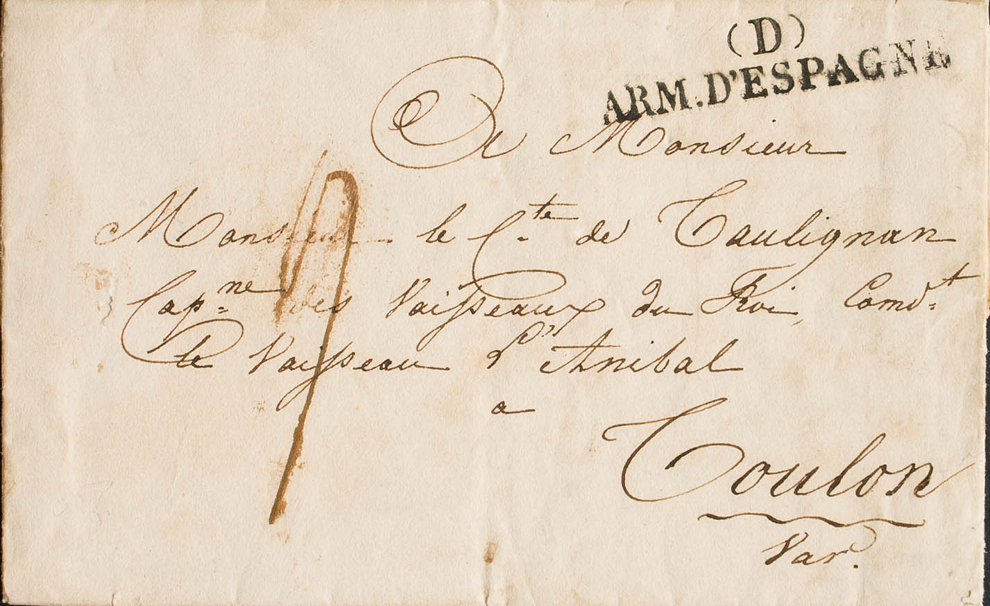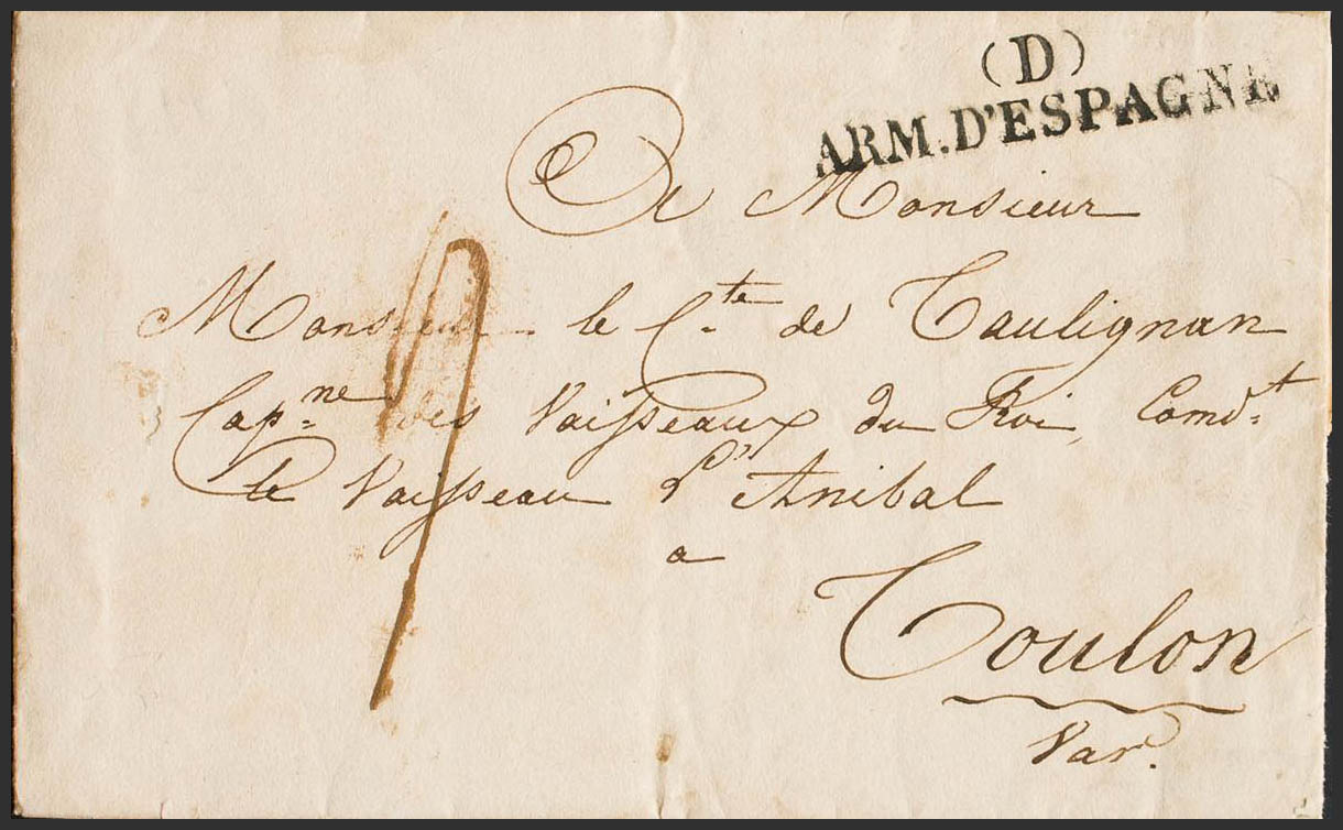 (1823ca). PAMPLONA a TOULON (FRANCIA). Marca (D) / ARM. D´ESPAGNE (Tizón X-32) de 1 de Octubre de 1823. MAGNIFICA.