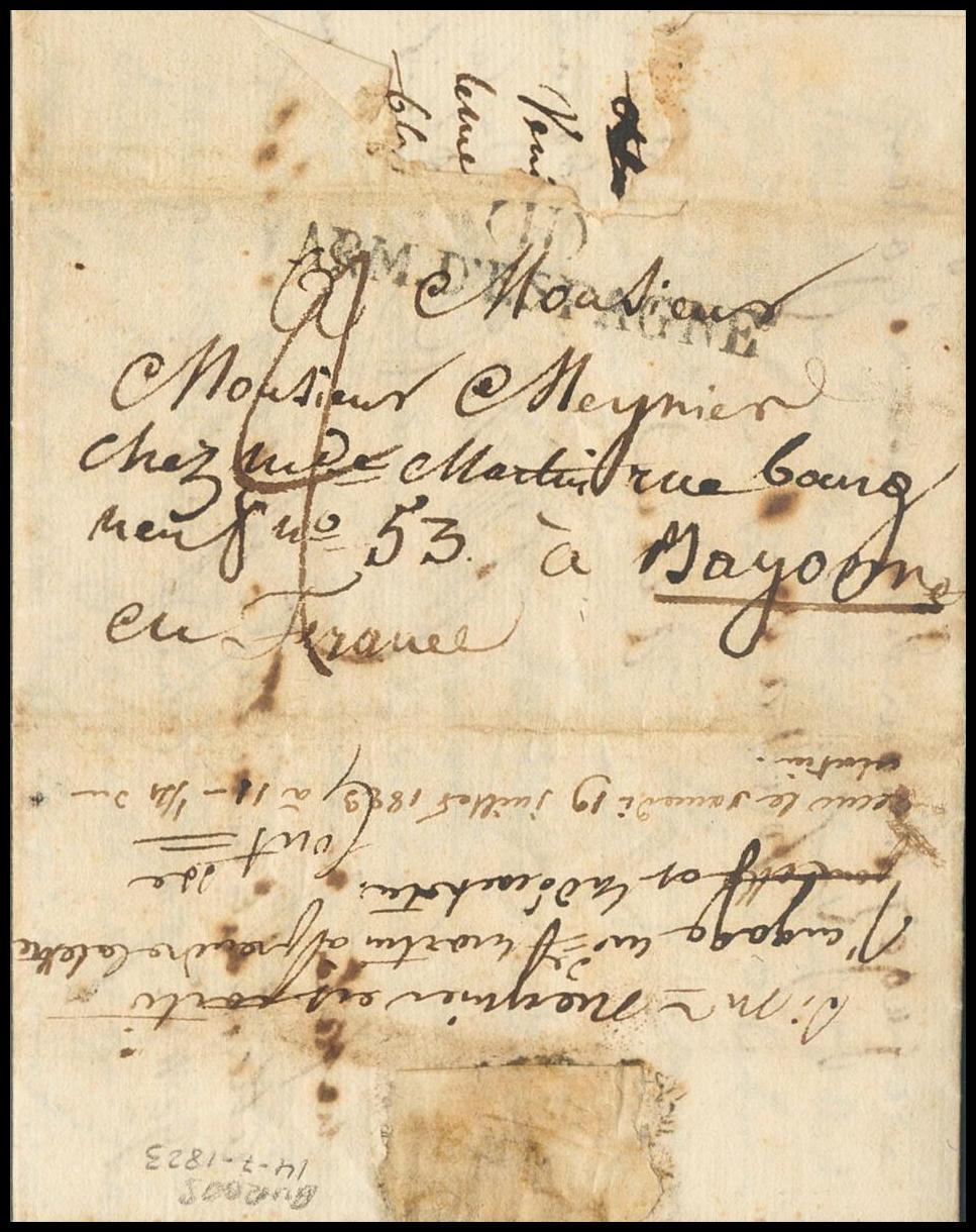 1823. (14 de Julio). BURGOS a BAYONA (FRANCIA). Marca (H) / ARM.D´ESPAGNE (Tizón X-41) y anotaciones manuscritas del cartero al dorso. MAGNIFICA Y RARA.