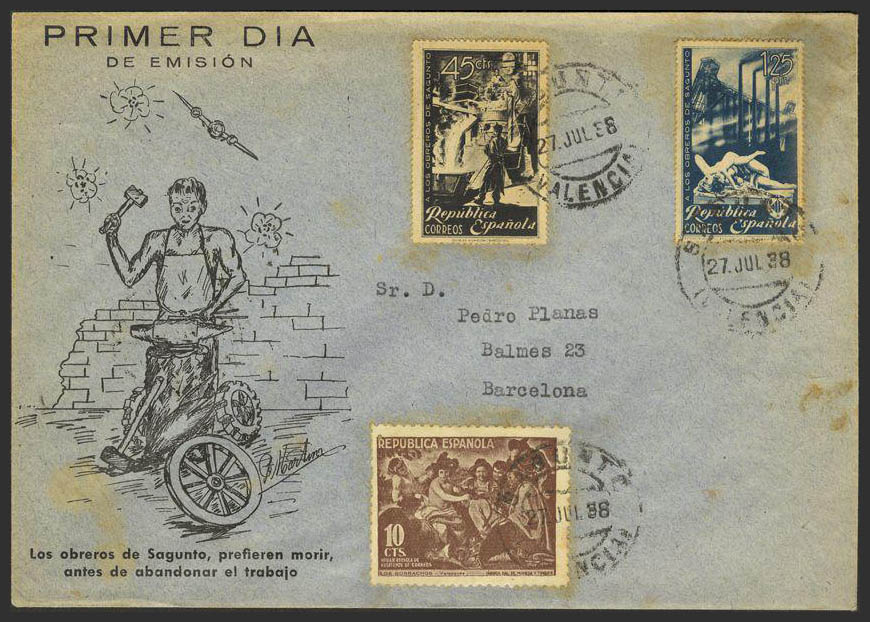 773/74. 1938. 45 cts y 1'25 pts. Sobre Primer DÃa de SAGUNTO a BARCELONA. Al dorso llegada. MAGNIFICO.