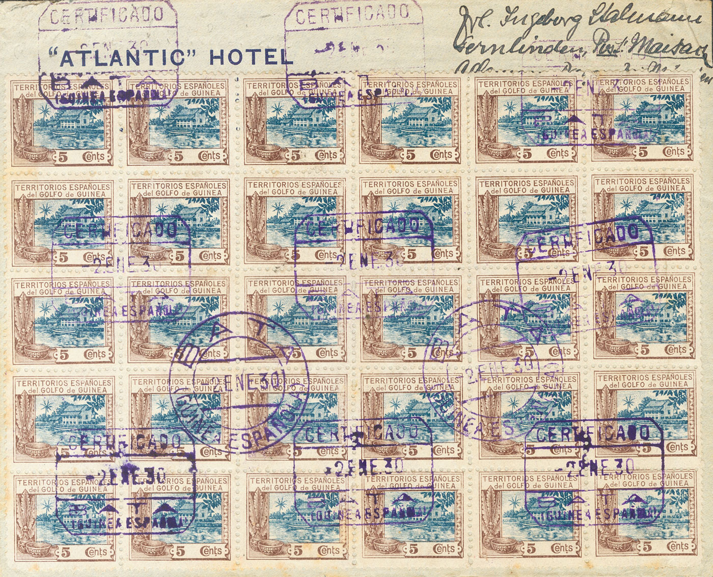 167(30). 1930. 5 cts castaño y azul, bloque de treinta. Certificado de BATA a MAISACH (ALEMANIA). Al dorso llegada. MAGNIFICA Y ESPECTACULAR FRANQUEO.