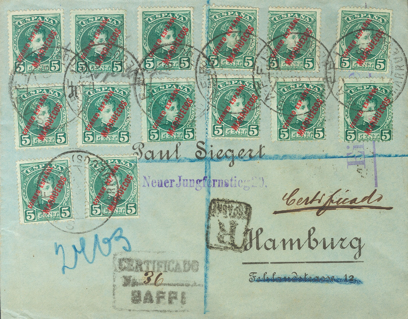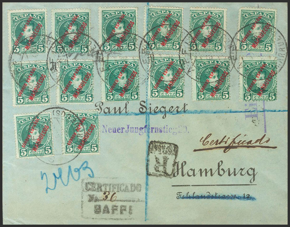 3. 1906. 5 cts verde, catorce sellos. Certificado de SAFFI a HAMBURGO (ALEMANIA). Al dorso tránsitos por Tánger y Madrid. MAGNIFICA Y RARISIMO Y ESPECTACULAR FRANQUEO.