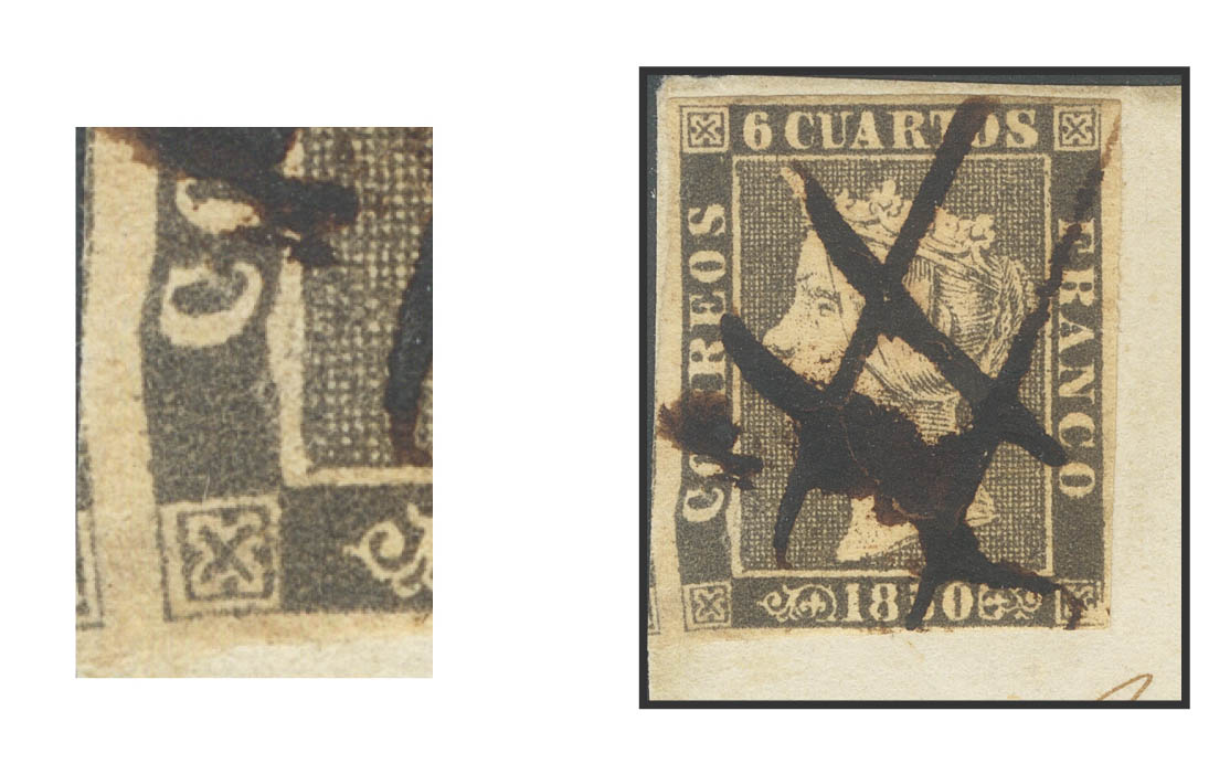 1A. 1850. 6 cuartos negro (inutilizado con trazos a pluma, defectitos sin importancia provocados por la corrosión de la tinta). Variedad en el cartucho izquierdo "C" y marco DEFORMADO. MAGNIFICO Y RARISIMO, NO RESEÑADO EN LA OBRA DE GUEZALA. (subastado en el año 1970 por Vicenti en la famosa subasta del 6 cuartos de 1850 de la colección Alfajeme, con el lote número 171, pieza de referencia y sin lugar a dudas una de las variedades más importantes y espectaculares del primer sello de España). Ex-Navascues.