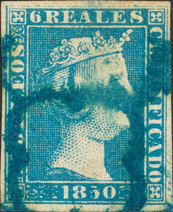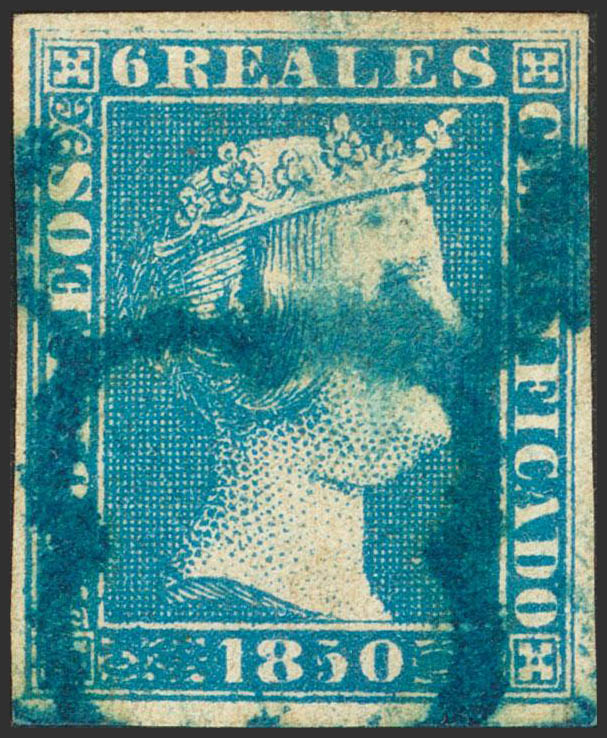 4. 1850. 6 reales azul. Matasello ARAÑA, en azul. MAGNIFICO Y RARISIMO. Cert. COMEX. Edifil 2014: 2.525 Euros