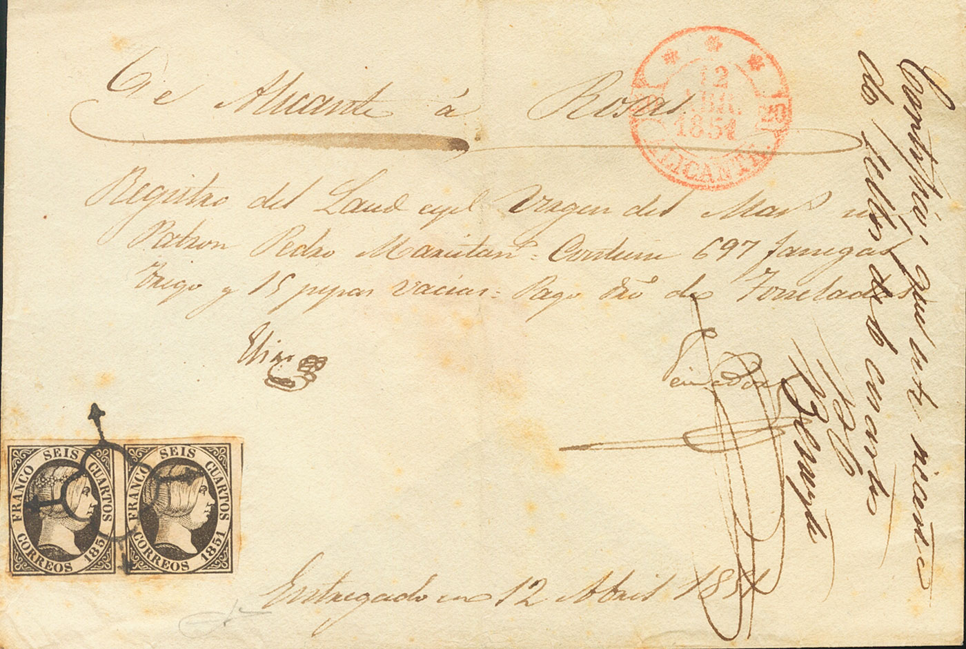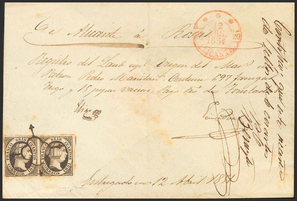 6(2). 1851. 6 cuartos negro, pareja. Registro de Embarque del Laúd Virgen del Mar de ALICANTE a ROSAS (GERONA). Matasello ARAÑA y en el frente baeza *** / ALICANTE y anotación manuscrita "Certifico que este necesita dos sellos de 6 cuartos" y de entrega. MAGNIFICO Y MUY RARO EN ESTA EMISION.