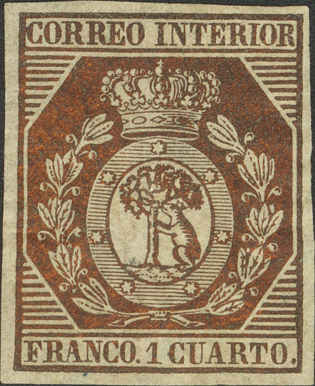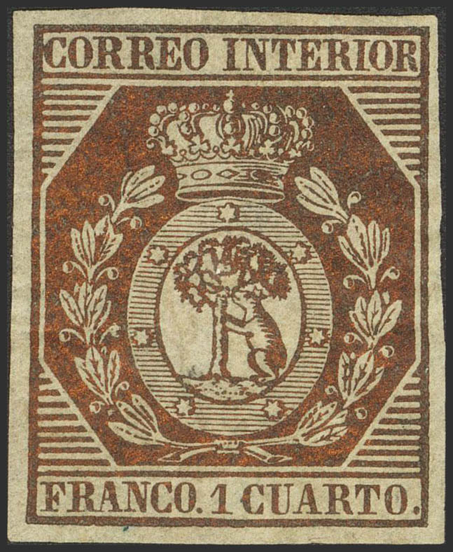 ★ 22. 1853. 1 cuarto bronce dorado. Color espectacular y márgenes enormes. PIEZA DE LUJO. Cert. GRAUS.