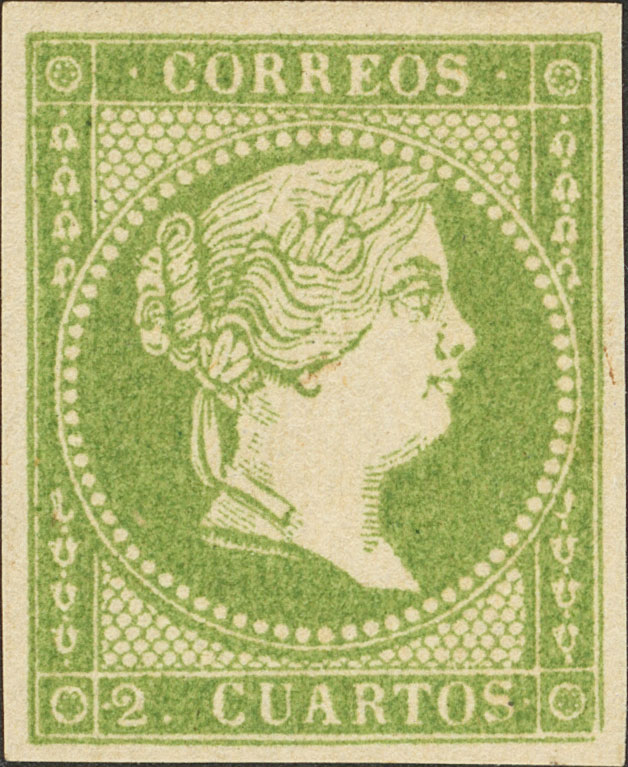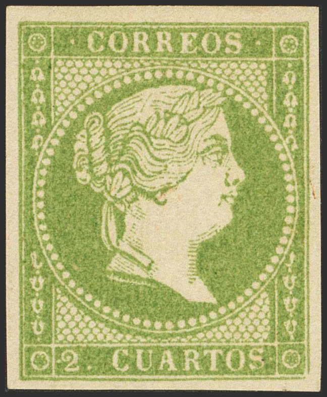 ★ 47. 1855. 2 cuartos verde. Color intenso y enormes márgenes. PIEZA DE LUJO. Cert. CEM.