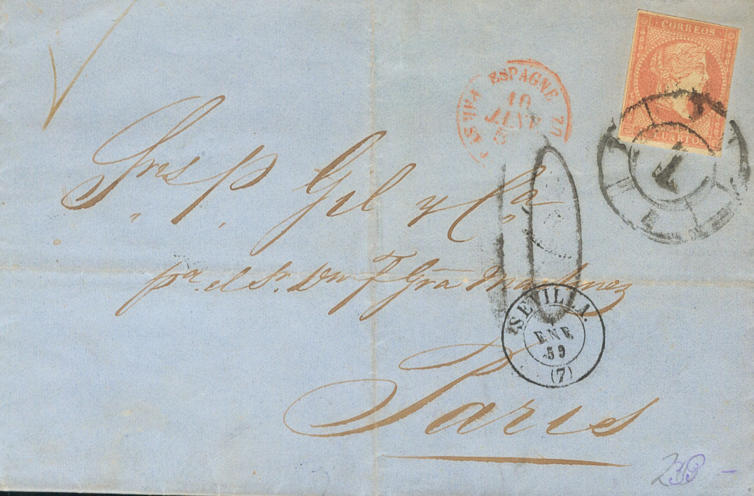 48. 1859. 4 cuartos rojo. SEVILLA a PARIS (FRANCIA). Matasello R.CARRETA Nº7 y en el frente porteo "10" manuscrito (doble porte), según el Convenio con Francia del 1 de Abril de 1849, no era necesario el franqueo previo de la correspondencia ordinaria y a partir de Agosto de 1859, en caso de estar franqueada se consideraba que pagaba el tránsito únicamente hasta la frontera. MAGNIFICA Y RARO DOBLE PORTE.