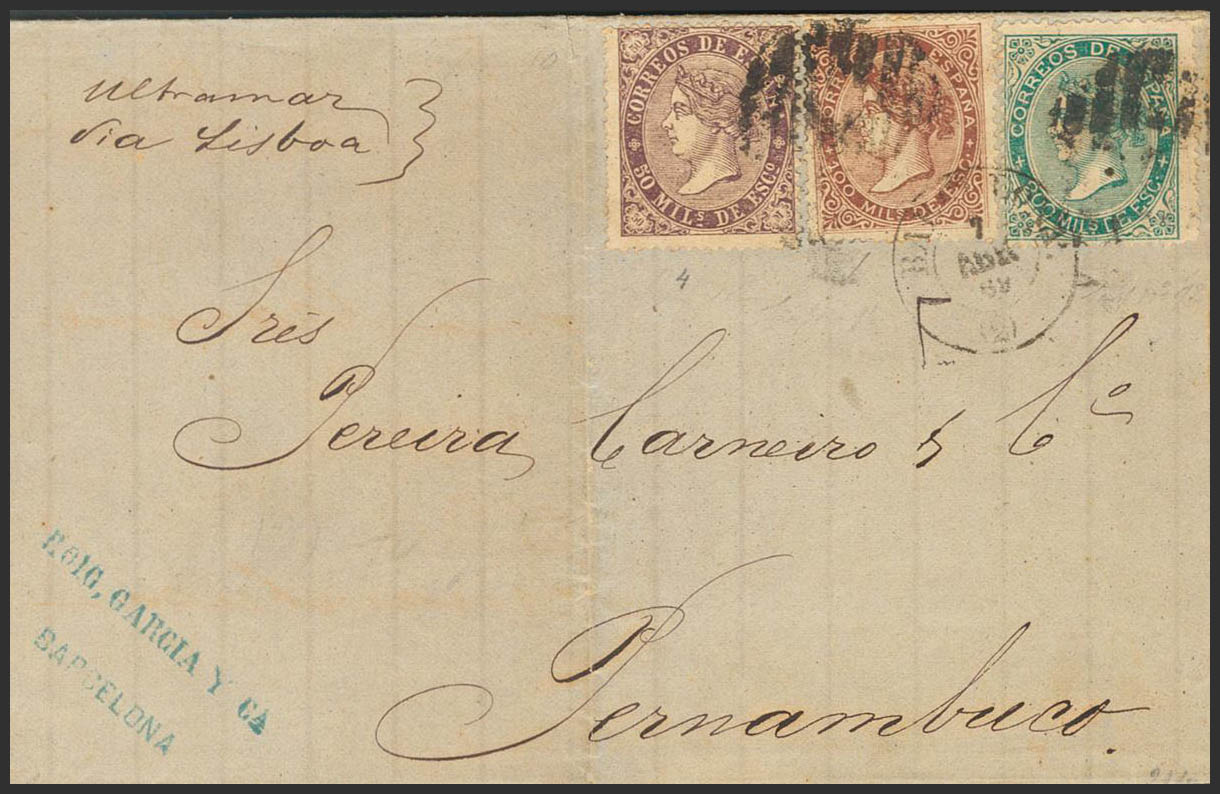 98, 99, 100. 1869. 50 mils violeta, 100 mils castaño y 200 mils verde. BARCELONA a PERNAMBUCO (BRASIL), circulada vía Lisboa. Al dorso tránsito y llegada. MAGNIFICA Y RARISIMO DESTINO, CIRCULADA CON EL RARISIMO 100 MILS CASTAÑO PARA COMPLETAR LA TARIFA DE 350 MILS.