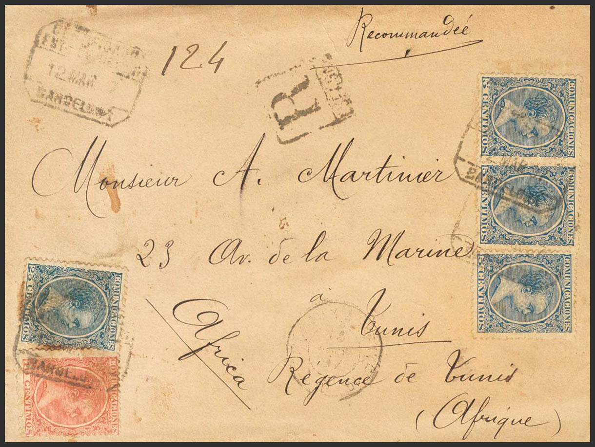 215(3), 217, 221. 1897. 5 cts azul, tres sellos, 10 cts castaño amarillo y 25 cts azul. Certificado de BARCELONA a TUNEZ. Al dorso llegada. MAGNIFICA Y MUY RARO DESTINO.