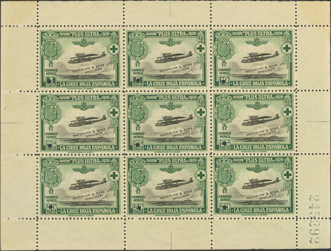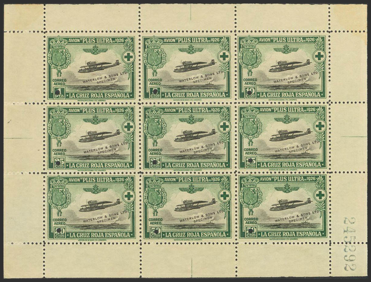 (★) 339H. 1926. 1 pts, 5 cts, 10 cts, 25 cts tres sellos, 50 cts tres sellos (minipliego de nueve sellos). COLORES CAMBIADOS, CON TALADRO y WATERLOW AND SONS LTD. MAGNIFICO Y RARO, PIEZA DE ENORME ESPECTACULARIDAD.