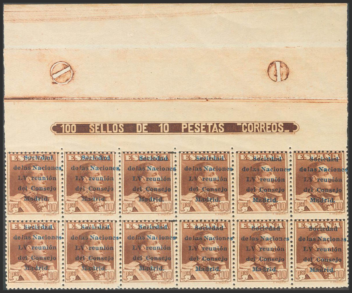 ★★ 455/68(12). 1929. Serie completa, bloque de doce cabecera de pliego con la leyenda. MAGNIFICA Y RARISIMO CONJUNTO DE ENORME ESPECTACULARIDAD, PROBABLEMENTE SE TRATE DEL BLOQUE MAS GRANDE CONOCIDO CONFORMANDO LA SERIE COMPLETA EN ESTA EXCECPIONAL CALIDAD. Cert. CEM. Edifil 2021: +++2.400 Euros