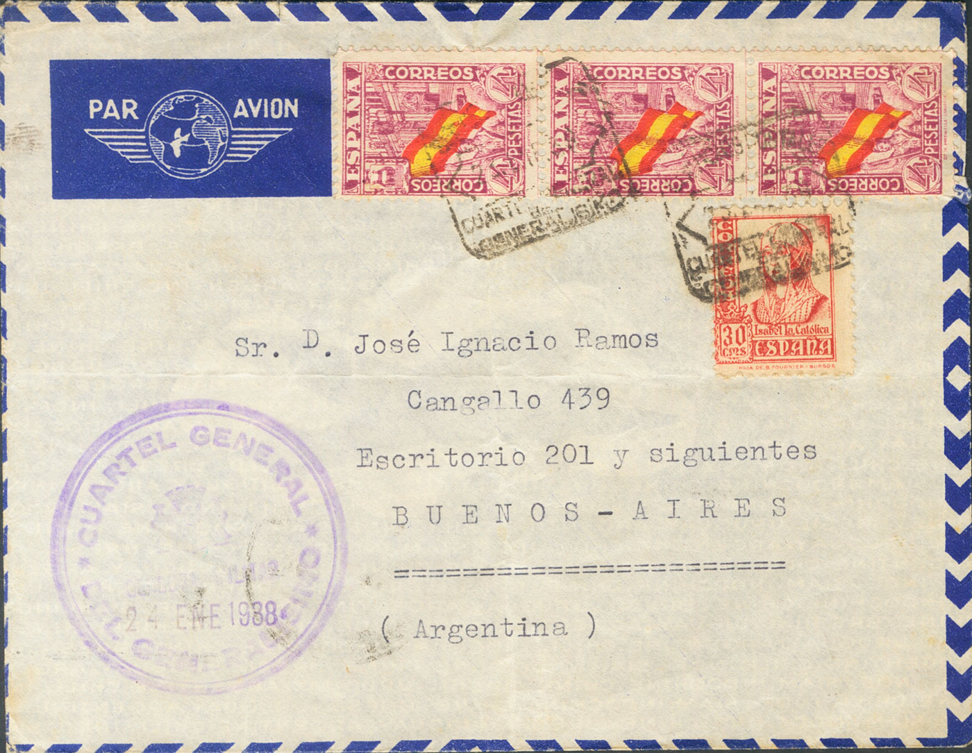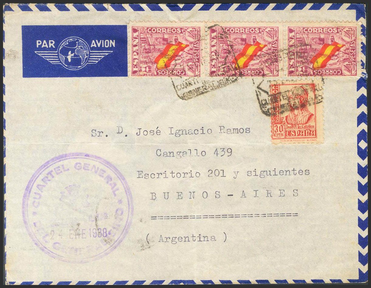 812(3), 823. 1937. 4 pts multicolor, tira de tres y 30 cts rosa. Certificado de BURGOS a BUENOS AIRES (ARGENTINA). Matasello CERTIFICADO / CUARTEL GENERAL / DEL / GENERALISIMO, al dorso llegada. MAGNIFICA Y EXTRAORDINARIAMENTE RARO FRANQUEO.