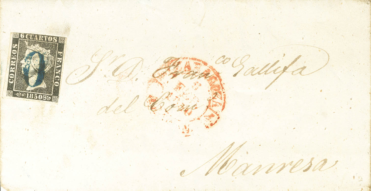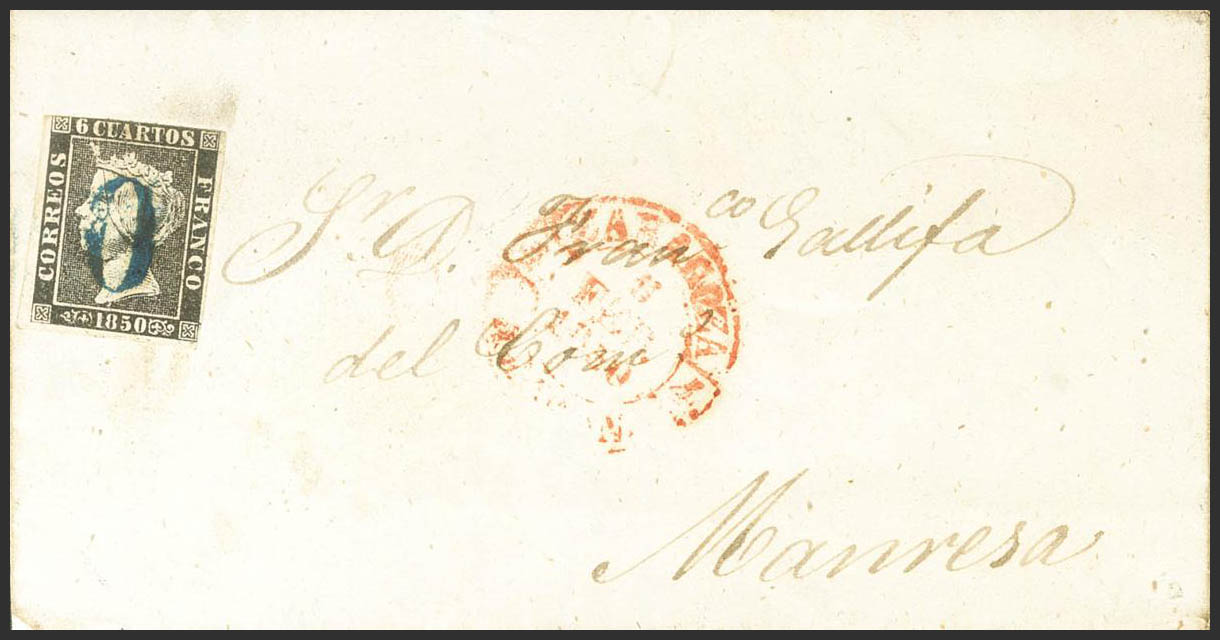 1. 1850. 6 cuartos negro. ZARAGOZA a MANRESA. Matasello prefilatélico "O" de Zaragoza, en azul. MAGNIFICA.