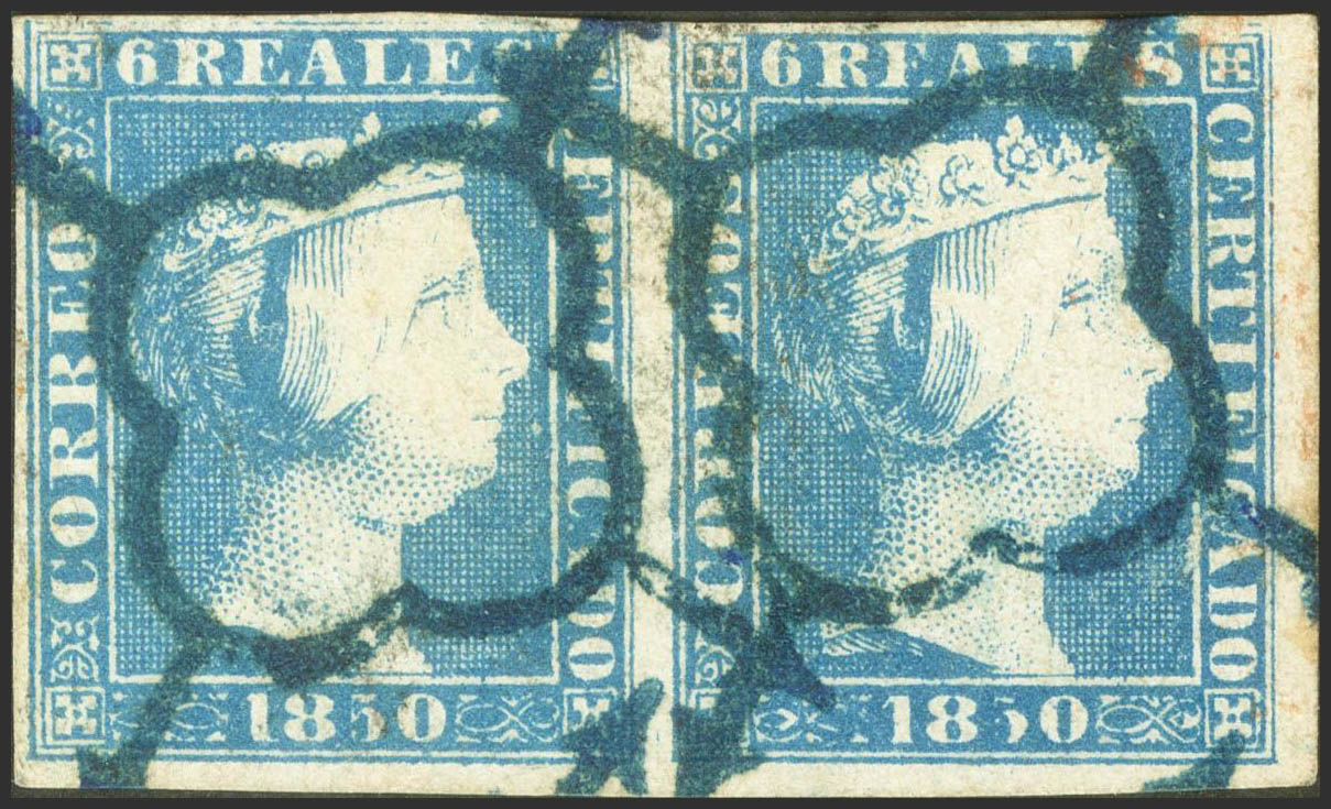 4(2). 1850. 6 reales azul, pareja. Matasello ARAÑA, en azul. MAGNIFICA Y RARISIMA PIEZA, ESPECIALMENTE EN ESTE COLOR, ESPECTACULAR DEBIDO A SU ENORME BELLEZA, PROBABLEMENTE EL MAYOR MULTIPLO CONOCIDO INUTILIZADO EN ESTE COLOR SOBRE EL 6 REALES DE 1850. Cert. COMEX. Ex Colección Isabella-Cervera (vendida el 3 de Mayo de 1989 en Zurich lote número 10088). Edifil 2020: +++3.300 Euros