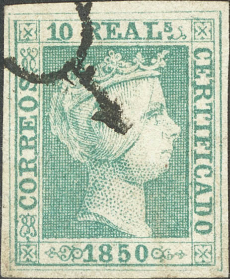 5. 1850. 10 reales verde. Matasello limpio y color muy intenso. PIEZA DE LUJO Y DE ENORME ESPECTACULARIDAD. Cert. CEM.