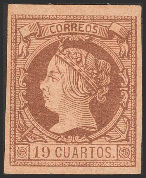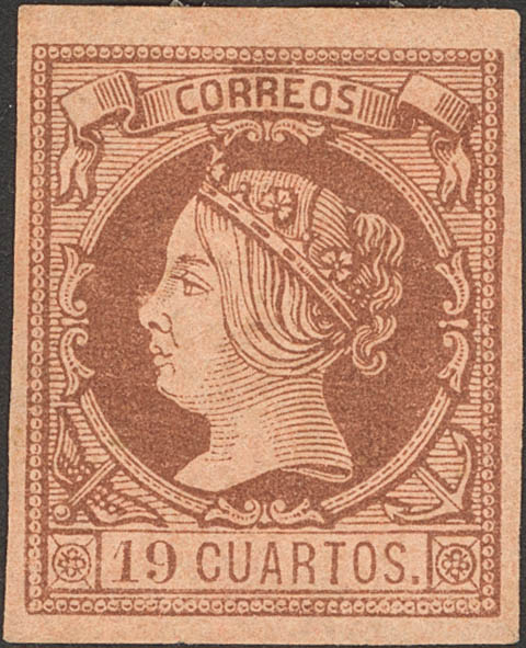 (★) 54. 1860. 19 cuartos castaño. Enormes márgenes y color intenso. PIEZA DE LUJO, SIN DUDA UNO DE LOS MEJORES EJEMPLARES CONOCIDOS. Cert. COMEX.