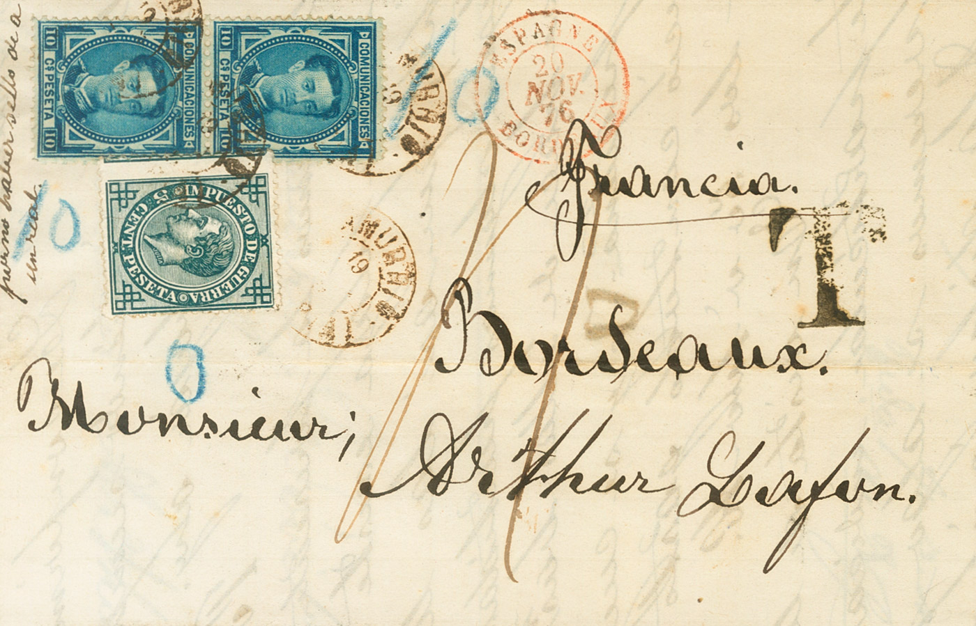 175(2), 183. 1876. (19 de Noviembre). 10 cts azul, dos sellos y 5 cts de Impuesto de Guerra. AMURRIO (ALAVA) a BURDEOS (FRANCIA). Matasello AMURRIO / VITORIA, tasada a la llegada por no ser aceptado el sello de Impuesto de Guerra para completar la tarifa de 25 cts, en el frente y junto a los sellos, manuscrito "Por no haber sello de 1 real", refiriéndose al sello Carlista de 1 real, que a pesar de haber finalizado la Guerra Carlista en Febrero de 1876 se seguÃan usando con posterioridad. MAGNIFICA Y UNICA CARTA CONOCIDA CON ESTA CIRCUNSTANCIA.