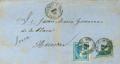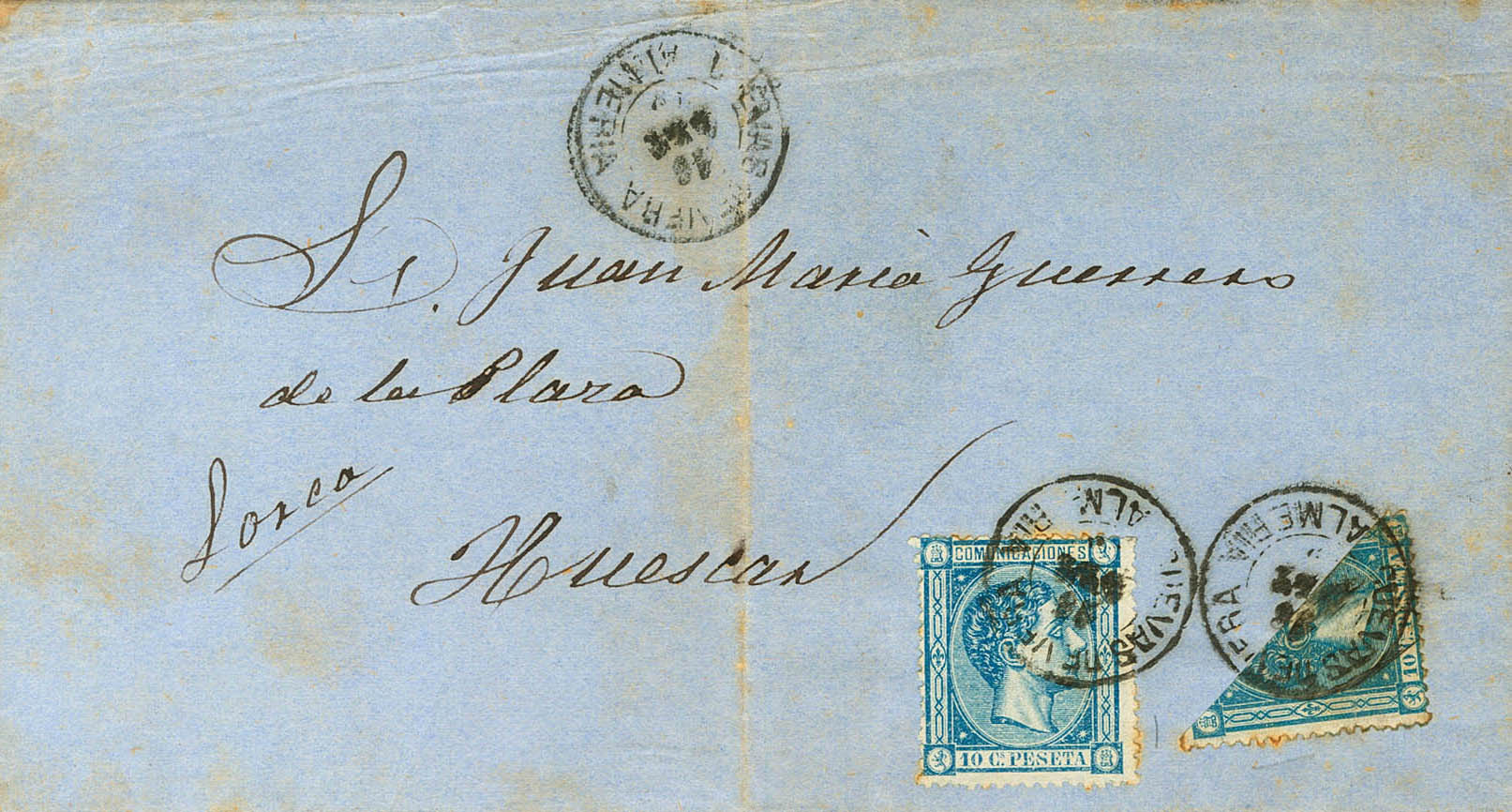 164(2). 1875. 10 cts azul, dos sellos, uno de ellos BISECTADO. CUEVAS DE VERA (ALMERIA) a HUESCAR (GRANADA). Matasello CUEVAS DE VERA / ALMERIA. MAGNIFICA Y EXTRAORDINARIAMENTE RARO USO DE UN SELLO DE CORREO ORDINARIO BISECTADO COMO SUSTITUTORIO DE IMPUESTO DE GUERRA. Cert. COMEX.