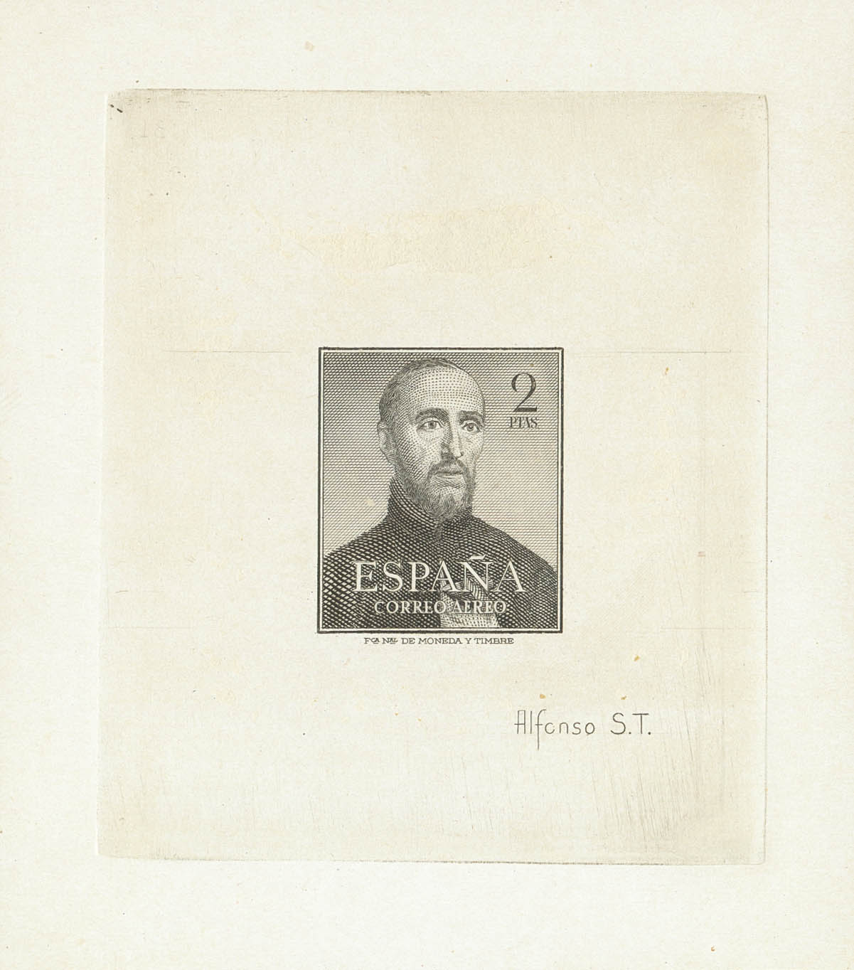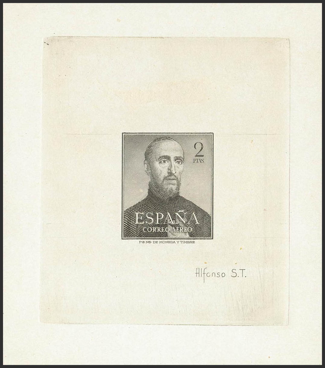 (★) 1118P. 1952. 2 pts negro. PRUEBA DE PUNZON, con nombre del grabador impreso ALFONSO S. T. MAGNIFICA Y RARISIMA.