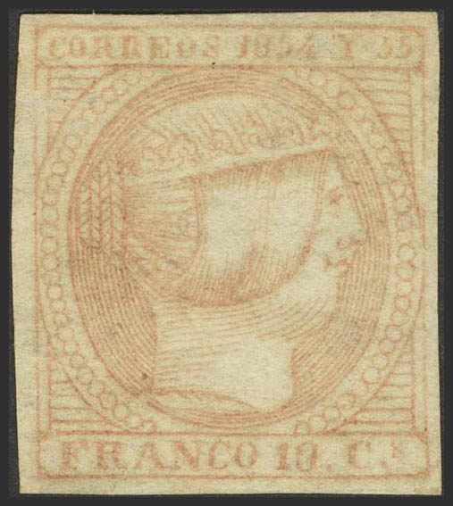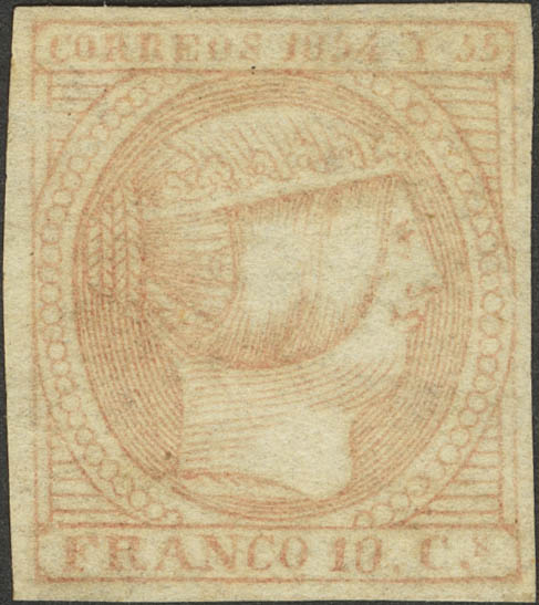 ★ 2d. 1854. 10 cuartos rosa. PIEZA DE LUJO Y RARA TONALIDAD DE COLOR, ESPECIALMENTE EN ESTA ESPECTACULAR CALIDAD. Cert. CEM. Edifil 2019: 1.275 Euros