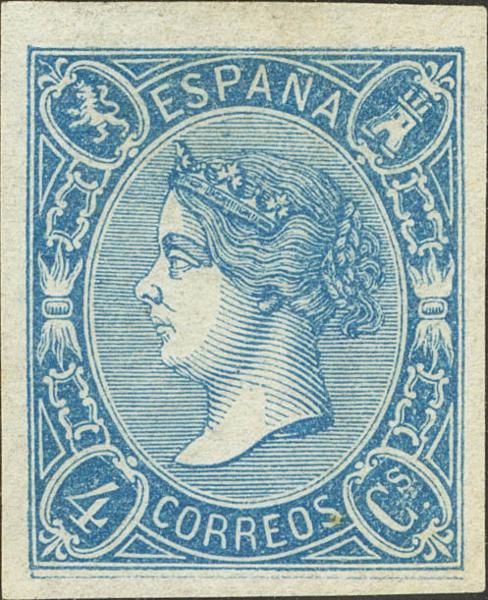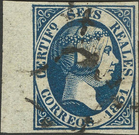 10. 1851. 6 reales azul, borde de hoja. Enormes márgenes y color muy nÃtido e intenso. PIEZA DE LUJO, SIN DUDA UNO DE LOS MEJORES CONOCIDOS. Cert. COMEX.