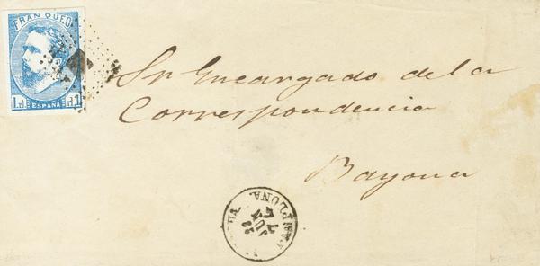 107(2). 1870. 50 mils ultramar, dos sellos. ANTEQUERA (MALAGA) a MURCIA, reexpedida a ALCOY. Matasello baeza ANTEQUERA / ANDAL.A., en negro. MAGNIFICA Y RARISIMO MATASELLO BAEZA CON UN USO TARDIO, PIEZA DE ENORME INTERES Y ESPECTACULARIDAD, PARA HACERNOS IDEA DE SU RAREZA, VALDES EN SU OBRA DEDICADA AL MATASELLO BAEZA SOLO MENCIONA SU USO EN LA EMISION DE LA MATRONA EN LA LOCALIDAD DE BUENDIA (ALCARRIA, GUADALAJARA) SOBRE UN BLOQUE DE CUATRO DE 2 ESCUDOS, QUE ADEMAS ESTA INUTILIZADO CON RAYAS DE TINTA, NOS ENCONTRAMOS SIN DUDA ANTE UNA PIEZA CLAVE DE LA EMISION DE LA MATRONA Y QUE TAMBIEN ABARCA EL AREA DE COLECCIONISMO DEDICADO A LOS "BAEZAS". Cert. CEM.