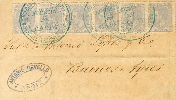 204(6). 1879. 25 cts azul gris, tira de seis sellos. CADIZ a BUENOS AIRES (ARGENTINA). Matasello COMPAÑIA S.B. LAVARELLO Y CIª / AGENCIA / DE / CADIZ / VAPORES TRANSATLANTICOS, en azul. MAGNIFICA Y UNICA CARTA CONOCIDA CON DOBLE PORTE Y CON ESTE ESPECTAULAR FRANQUEO.