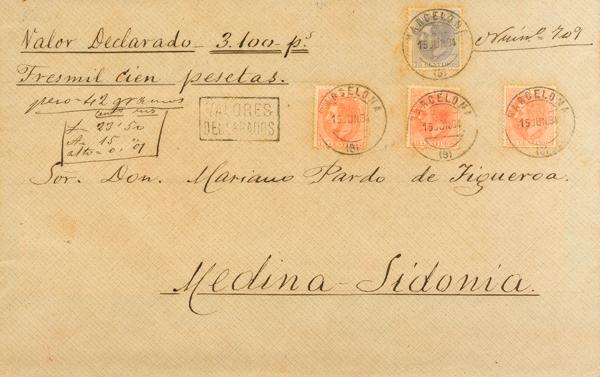 210(3), 212. 1884. 15 cts naranja, tres sellos y 75 cts violeta gris. Frontal de Certificado de BARCELONA a MEDINA-SIDONIA (CADIZ), dirigida a Don Mariano Pardo de Figueroa (Dr.Thebussem). Al dorso nota del Administrador General de Correos de Barcelona. MAGNIFICA Y RARISIMA CARTA DIRIGIDA AL ILUSTRE PERSONAJE.