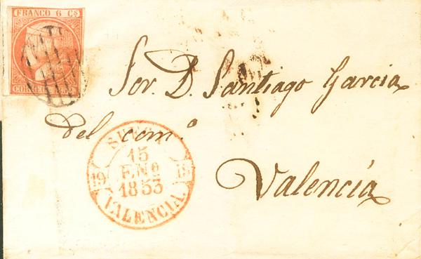 12. 1853. (15 de Enero). 6 cuartos rosa. SUECA a VALENCIA. En el frente baeza SUECA / 15-ENº-1853 / VALENCIA. MAGNIFICA Y EXTRAORDINARIAMENTE RARA, SOLO CONOCEMOS OTRA CON ORIGEN EN TARREGA Y COMO ESTA PROCEDENTE DE LA COLECCION DE TIZON, UTILIZADA QUINCE DIAS DESPUES DEL PLAZO DE UTILIZACION Y NO TASADA. Ex-Tizón.