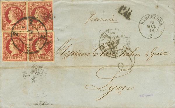 53(4). 1861. 12 cuartos carmÃn, cuatro sellos. BARCELONA a LYON (FRANCIA). MAGNIFICA Y RARISIMO CUADRUPLE PORTE, PIEZA DE ENORME ESPECTACULARIDAD.