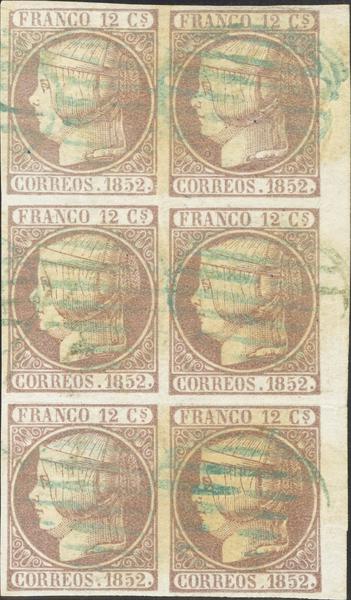 13(6). 1852. 12 cuartos lila, bloque de seis y borde de hoja. Matasello PARRILLA, en azul. PIEZA DE LUJO. Cert. GRAUS. Edifil 2020: +++2.145 Euros
