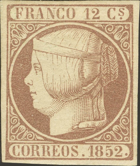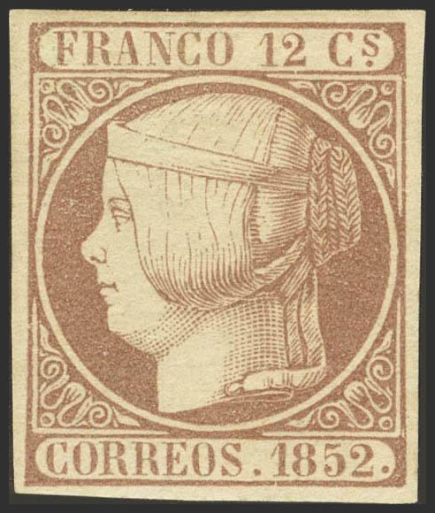 ★ 13. 1852. 12 cuartos lila. Grandes márgenes y color intenso. PIEZA DE LUJO. Cert. COMEX.