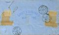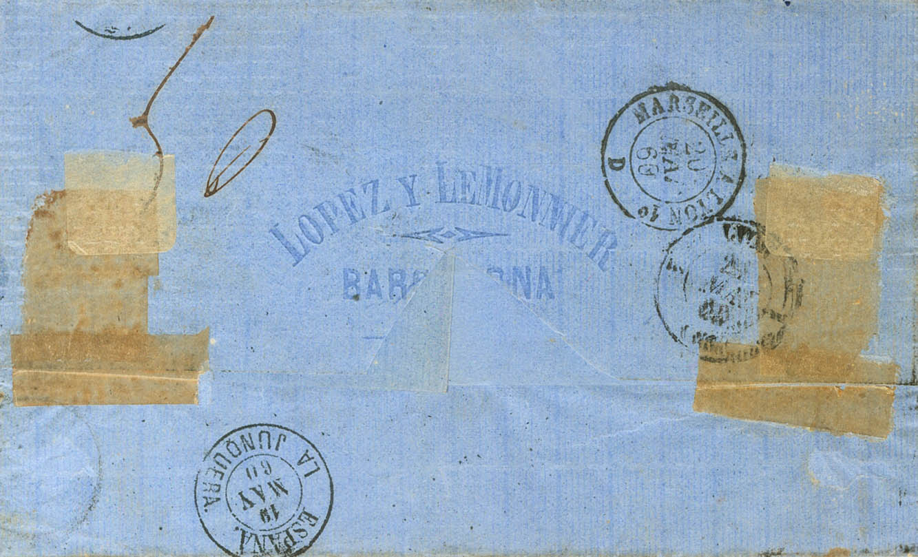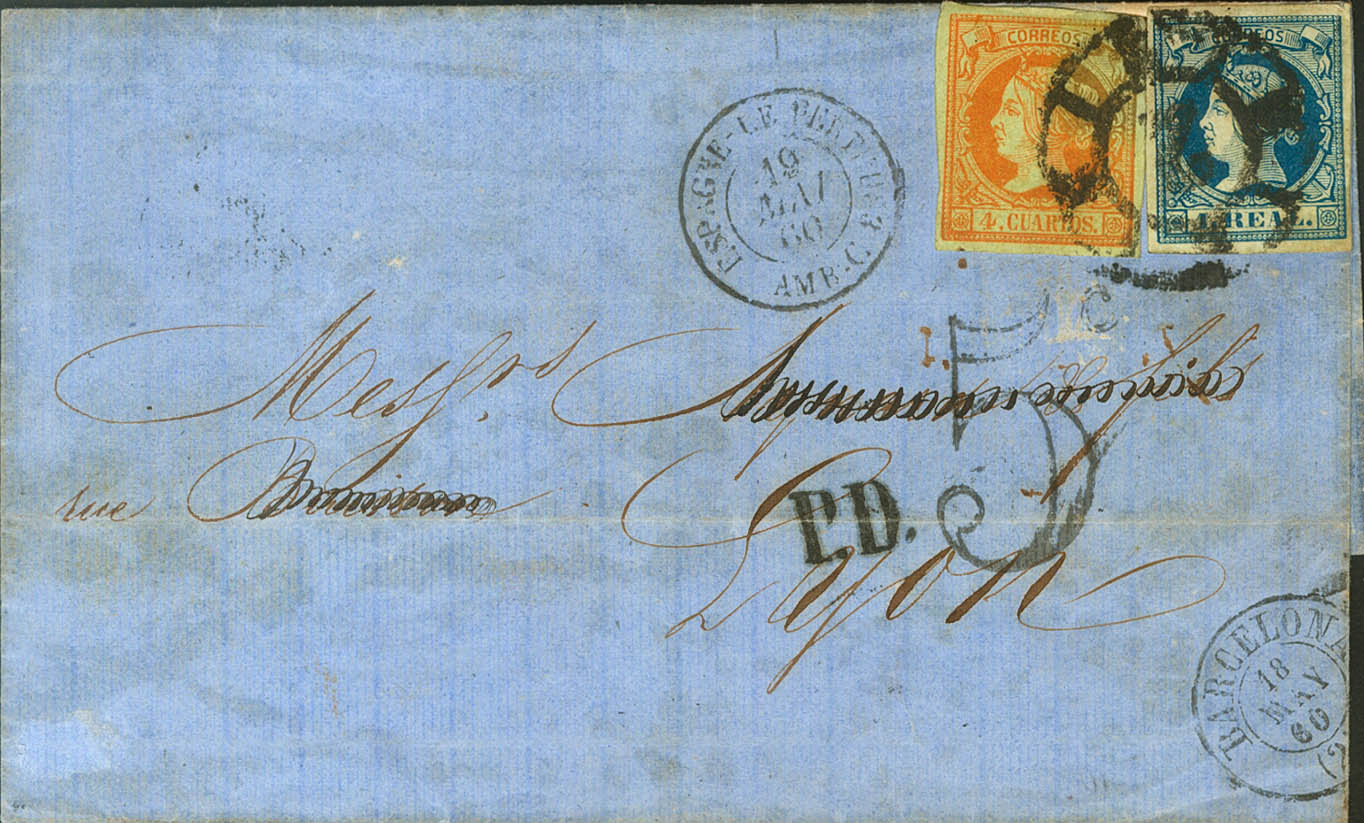 52, 55. 1860. 4 cuartos naranja y 1 real azul. BARCELONA a LYON (FRANCIA). MAGNIFICA Y EXTRAORDINARIAMENTE RARO FRANQUEO PARA COMPONER LA TARIFA DE 12 CUARTOS A FRANCIA, CON EXCESO DE ½ CUARTO, SOLO OTRA CONOCIDA.