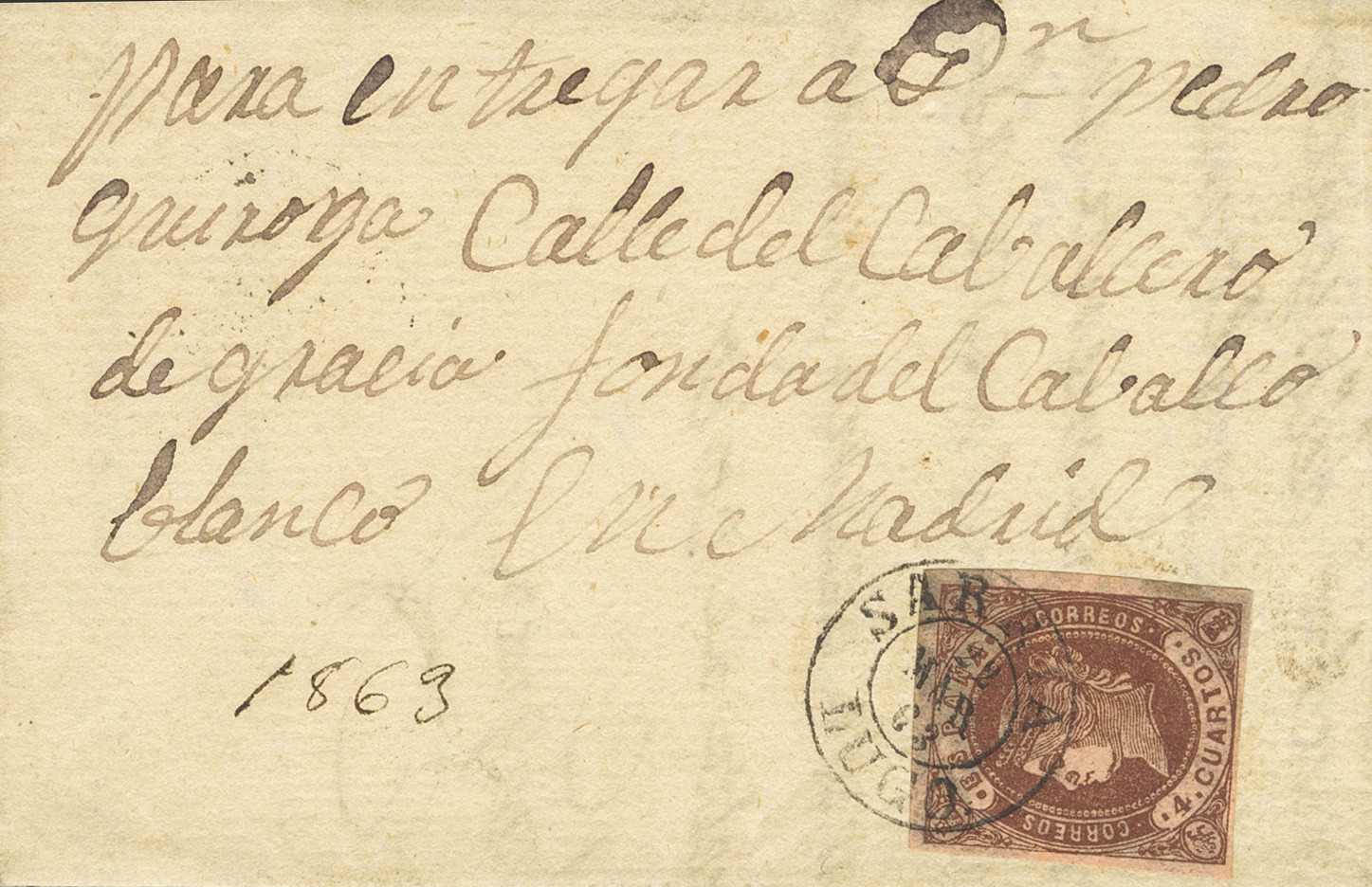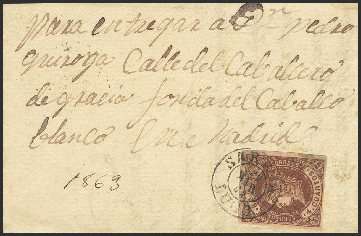 58. 1863. 4 cuartos castaño. SARRIA (LUGO) a MADRID. Matasello SARRIA / LUGO (tipo modificado). MAGNIFICA Y RARISIMA.