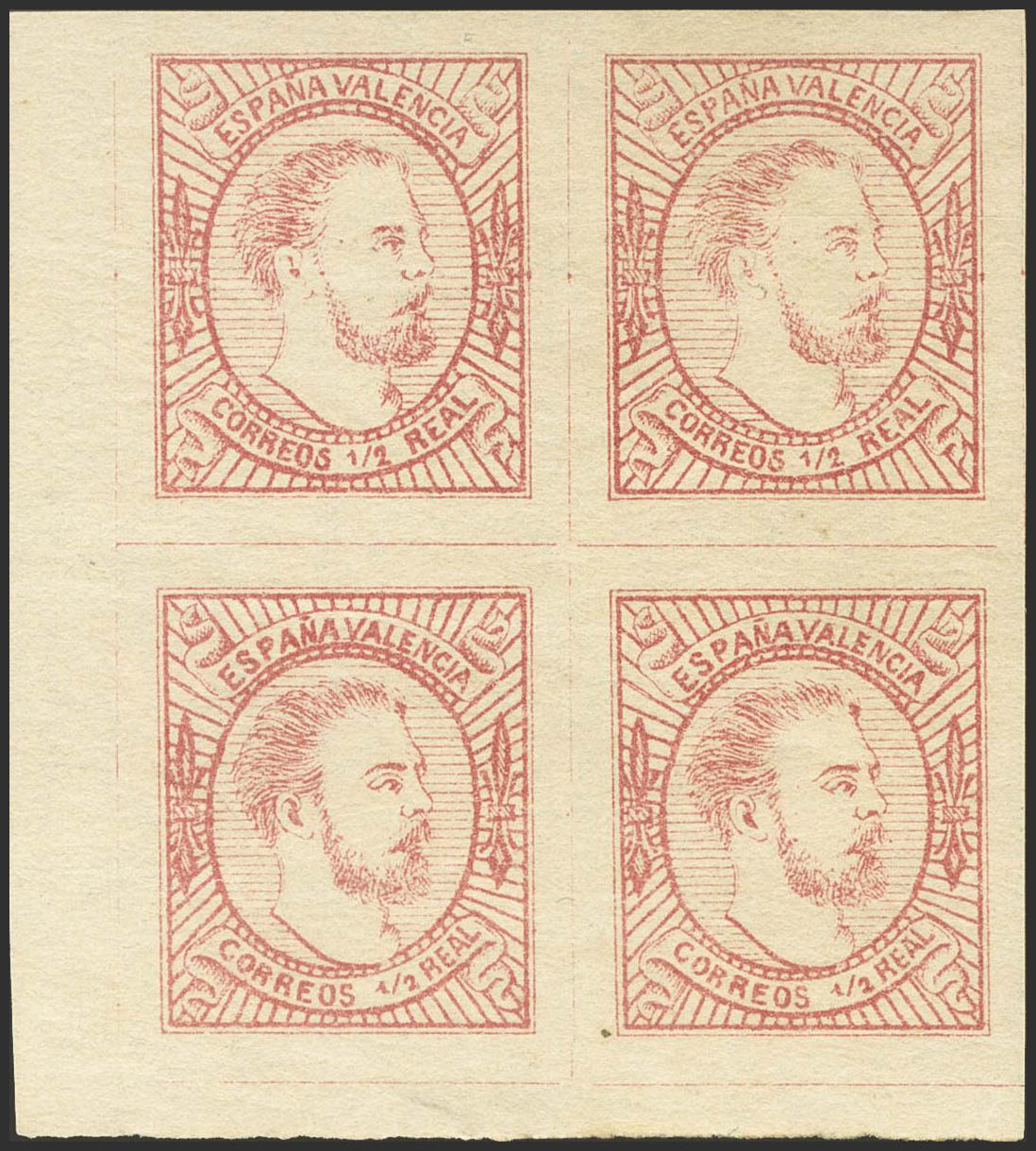 ★★/★ 159(2), 159A(2). 1874. ½ real rosa, bloque de cuatro, esquina de pliego (Tipos I y II). PIEZA DE LUJO.