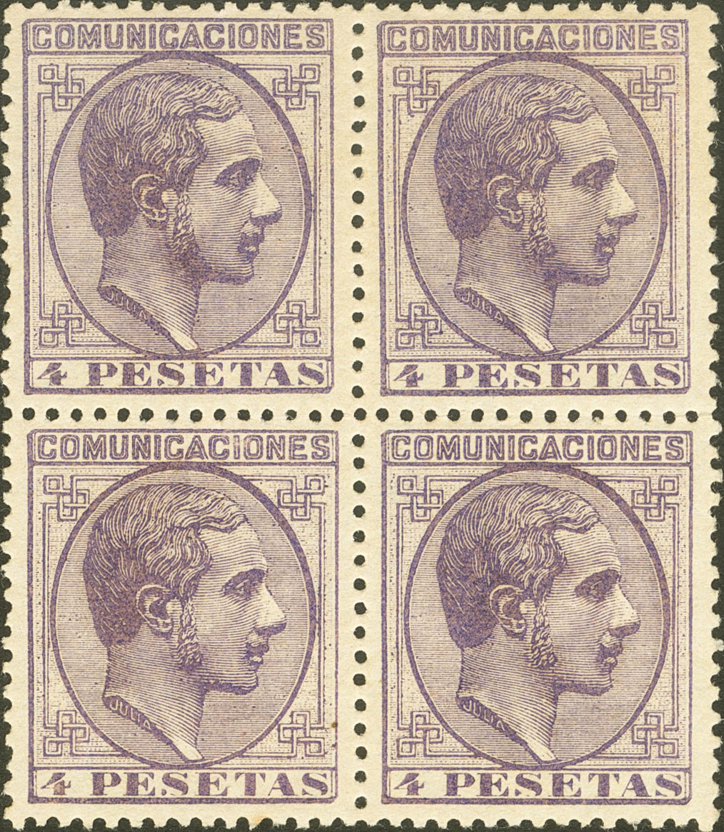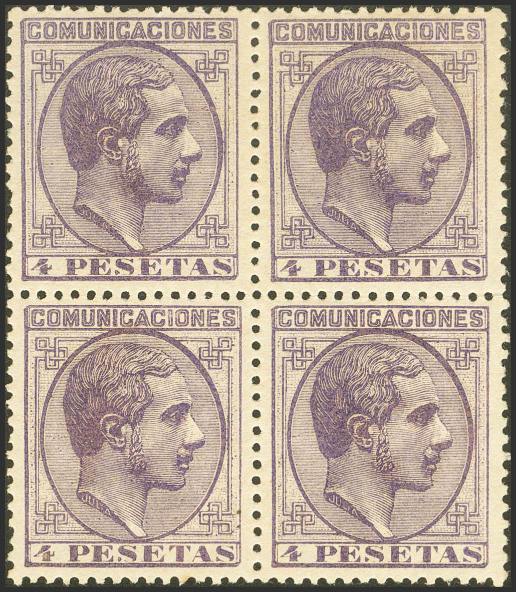 ★ 198(4). 1878. 4 pts violeta, bloque de cuatro. Color intenso y excelente centraje. MAGNIFICO Y RARO EN ESTA EXCEPCIONAL CALIDAD. Cert. GRAUS.