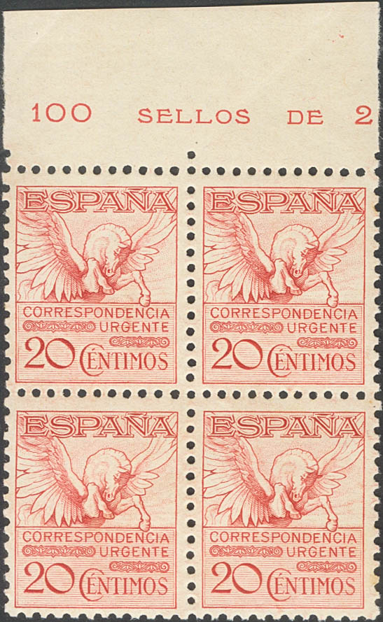 ★★ 592A(4). 1931. 20 cts rosa, bloque de cuatro, borde de hoja. Excelente centraje. MAGNIFICO Y RARO. Edifil 2024: ++520 Euros