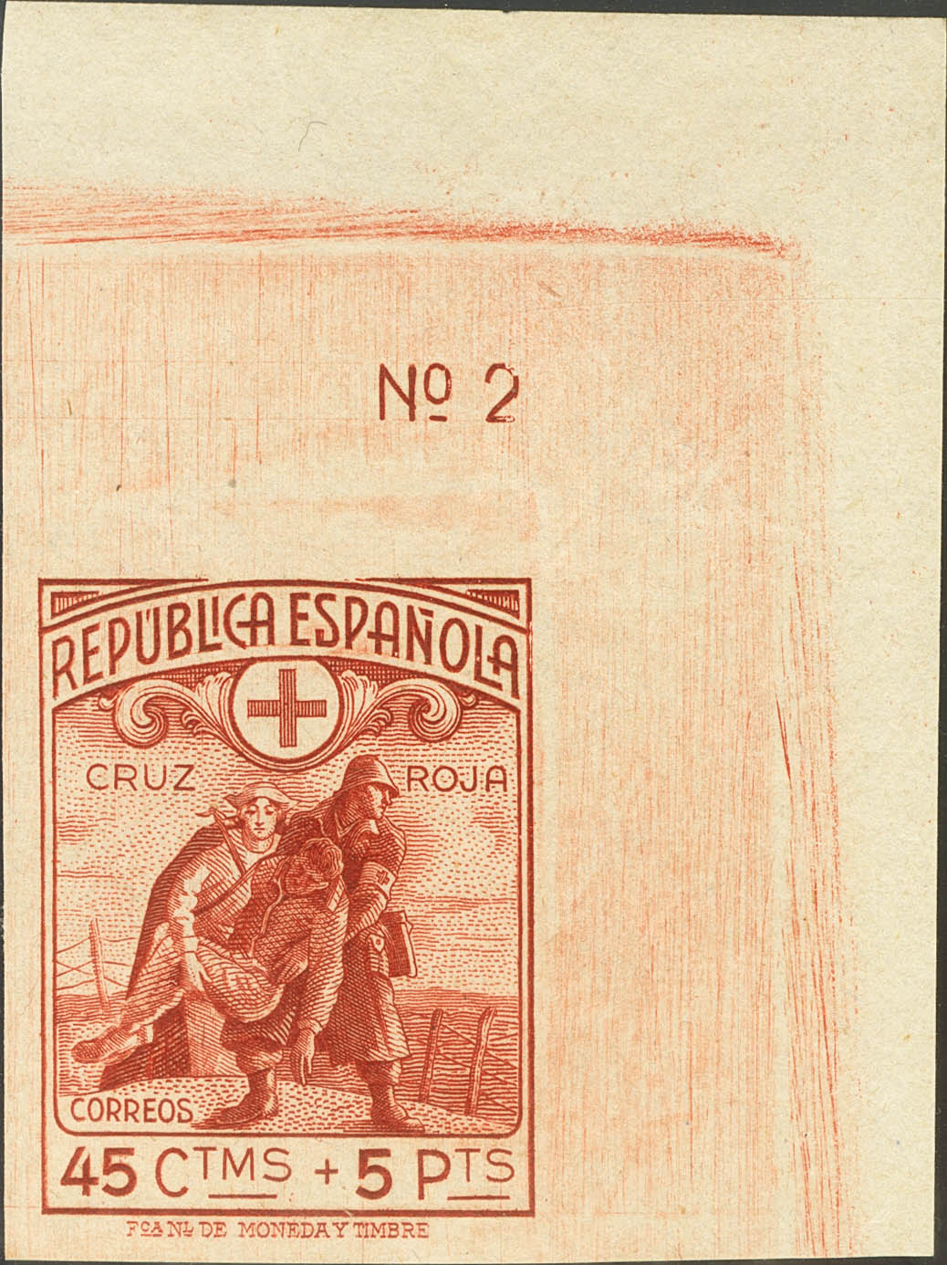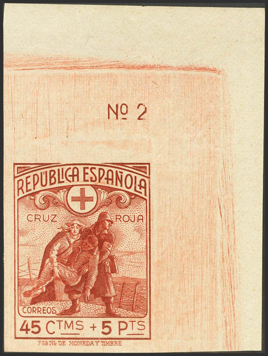 ★★ 767s. 1938. 45 cts + 5 pts rojo anaranjado, esquina de pliego. SIN DENTAR. PIEZA DE LUJO. Edifil 2024: +++235 Euros