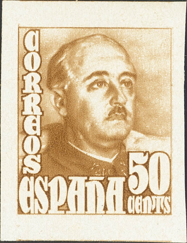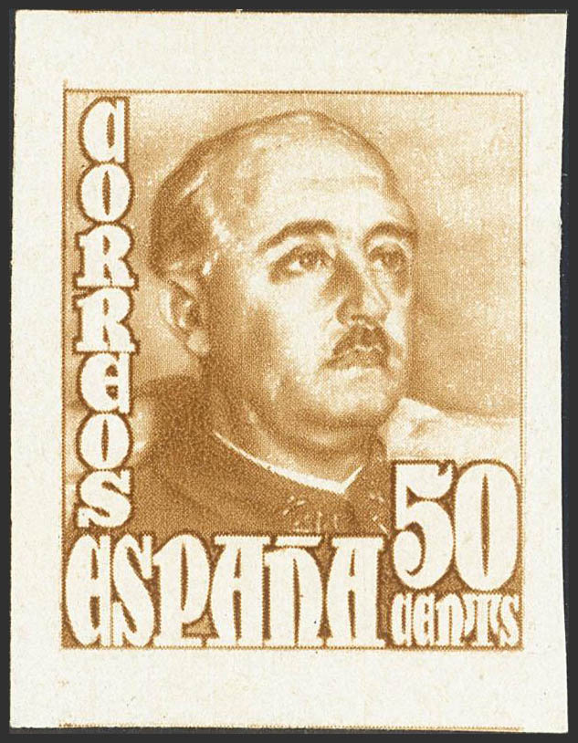 ★ 1022s. 1948. 50 cts castaño amarillo. SIN DENTAR. MAGNIFICO, PIEZA DE ENORME ESPECTACULARIDAD POR SUS ENORMES MARGENES. Cert. CEM.