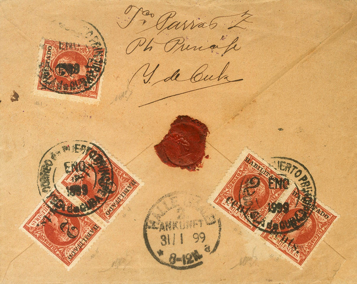 2(4), 2A. 1899. 2 cts sobre 2 mils castaño amarillo 1ª TIRADA, cinco sellos franqueados al dorso y utilizados como cierre (se trata de la tira de cinco fraccionada). Certificado de PUERTO-PRINCIPE a HALLE-SAALE (ALEMANIA), remitido por Francisco Parras, Administrador de Correos de la ciudad y conocido coleccionista, a quién debemos la mayorÃa de las cartas de esta emisión. Matasello CORREO DE PUERTO PRINCIPE / YSLA DE CUBA, en el frente tres marcas de certificado, una aplicada en tránsito por La Habana y llegada al dorso. MAGNIFICA Y UNICA CONOCIDA CON LOS CINCO TIPOS DE LA 1ª TIRADA, PIEZA DE ENORME INTERES Y QUE HISTORICAMENTE HA FORMADO PARTE DE LAS GRANDES COLECCIONES DE PUERTO PRINCIPE. Ex-Tows, Robertson, Brock, Kouri y Thompson. Cert. ECHENAGUSIA.