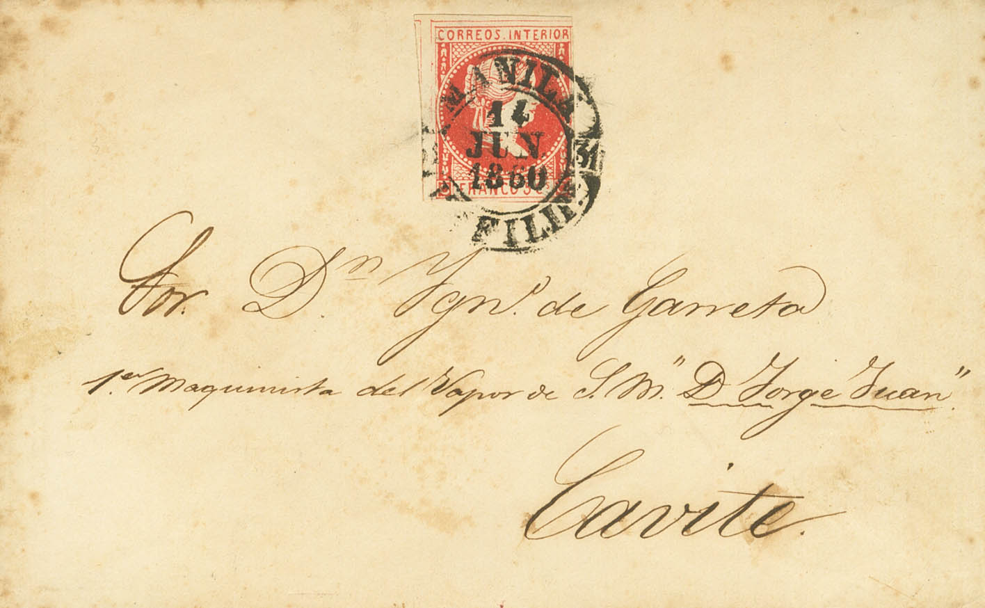 7. 1860. 5 cuartos bermellón. MANILA a CAVITE, dirigida al "Maquinista del Vapor de Guerra Jorge Juan, Don Ignacio Garreta", que junto a otras naves (Elcano, Corbeta Narváez y Goleta Constancia) participaron junto al ejército francés en la Guerra de Conchinchina (Vietnam), que comenzó en Agosto de 1858 y finalizó en Marzo de 1862 con la firma de un tratado de paz entre Francia y el rey de Annam. MAGNIFICA Y RARISIMA CON ORIGEN EN FILIPINAS, ESPECIALMENTE DESTINADA AL TRIPULANTE DE UN BUQUE EN MISION DE GUERRA, EXTRAORDINARIAMENTE RAROS LOS DOCUMENTOS RELACIONADOS CON LA CAMPAÑA MILITAR DE COCHINCHINA, ESPECIALMENTE POSTALES.