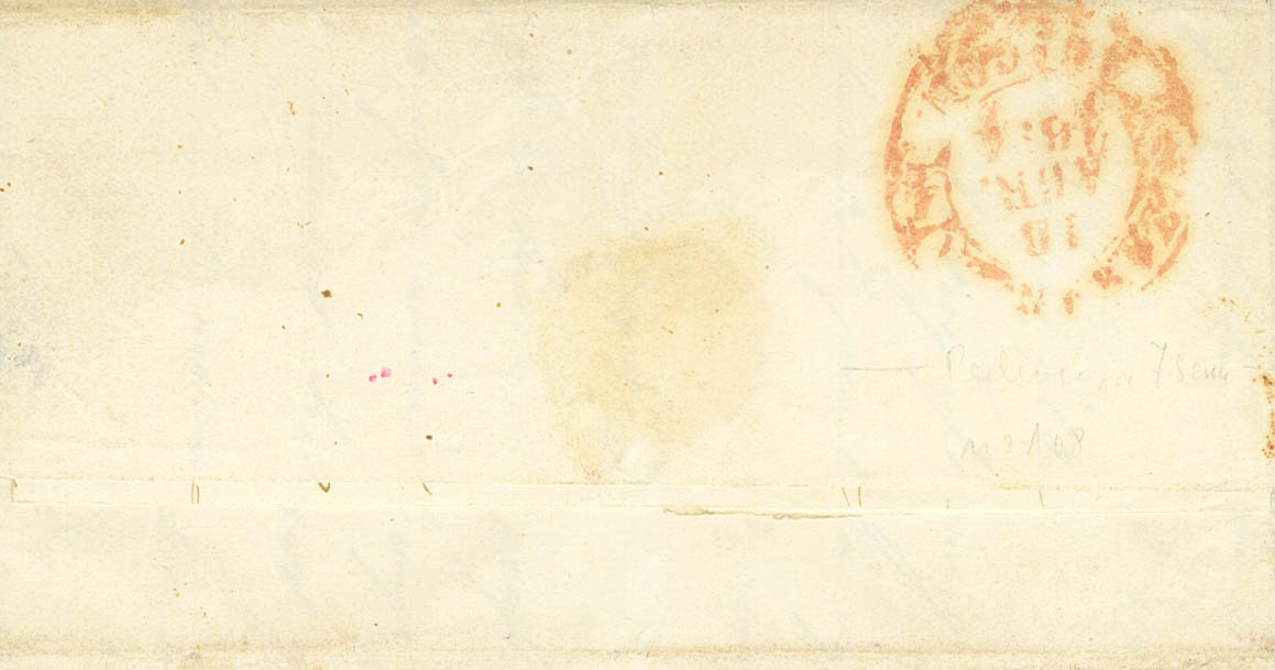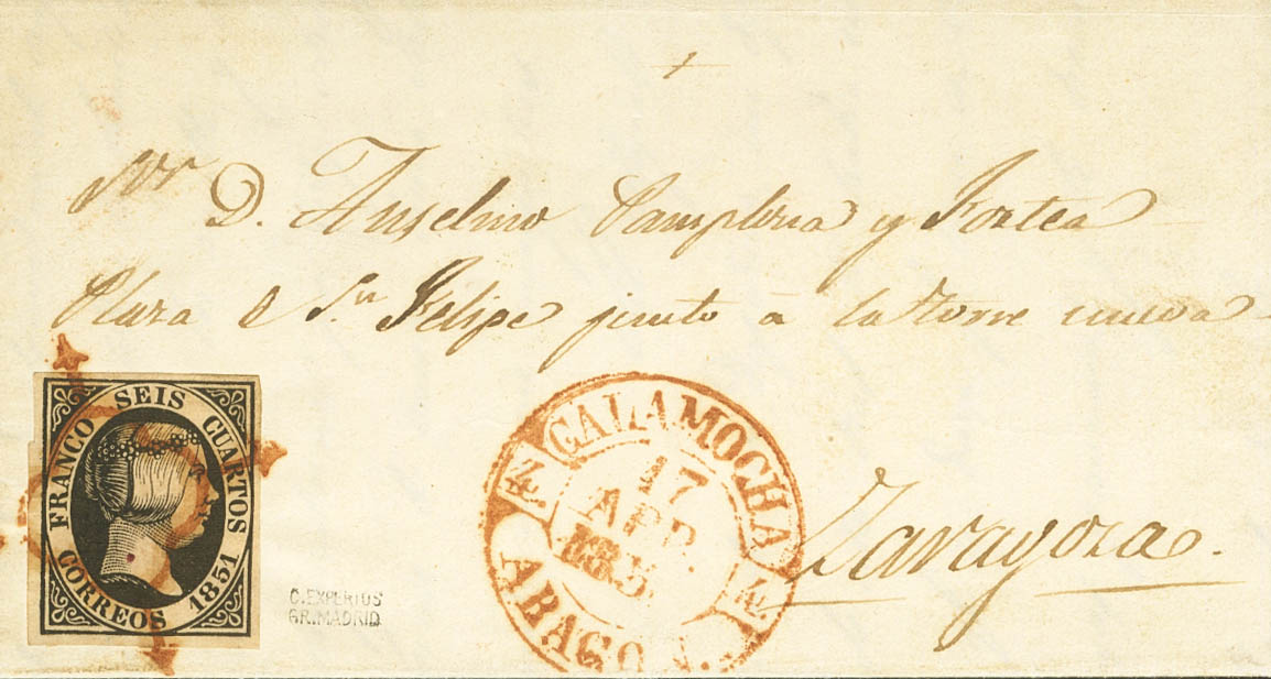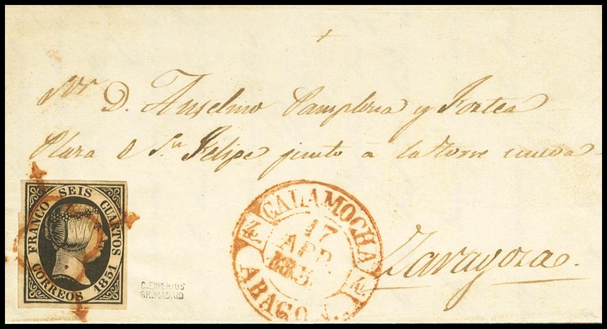 6. 1851. 6 cuartos negro. CALAMOCHA a ZARAGOZA. Matasello ARAÑA, en rojo. MAGNIFICA Y MUY RARA, PIEZA DE ESPECTACULAR BELLEZA.