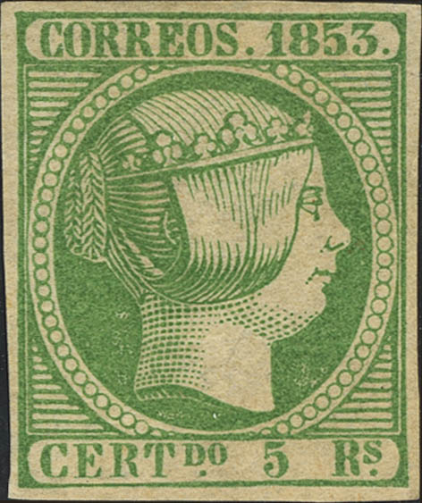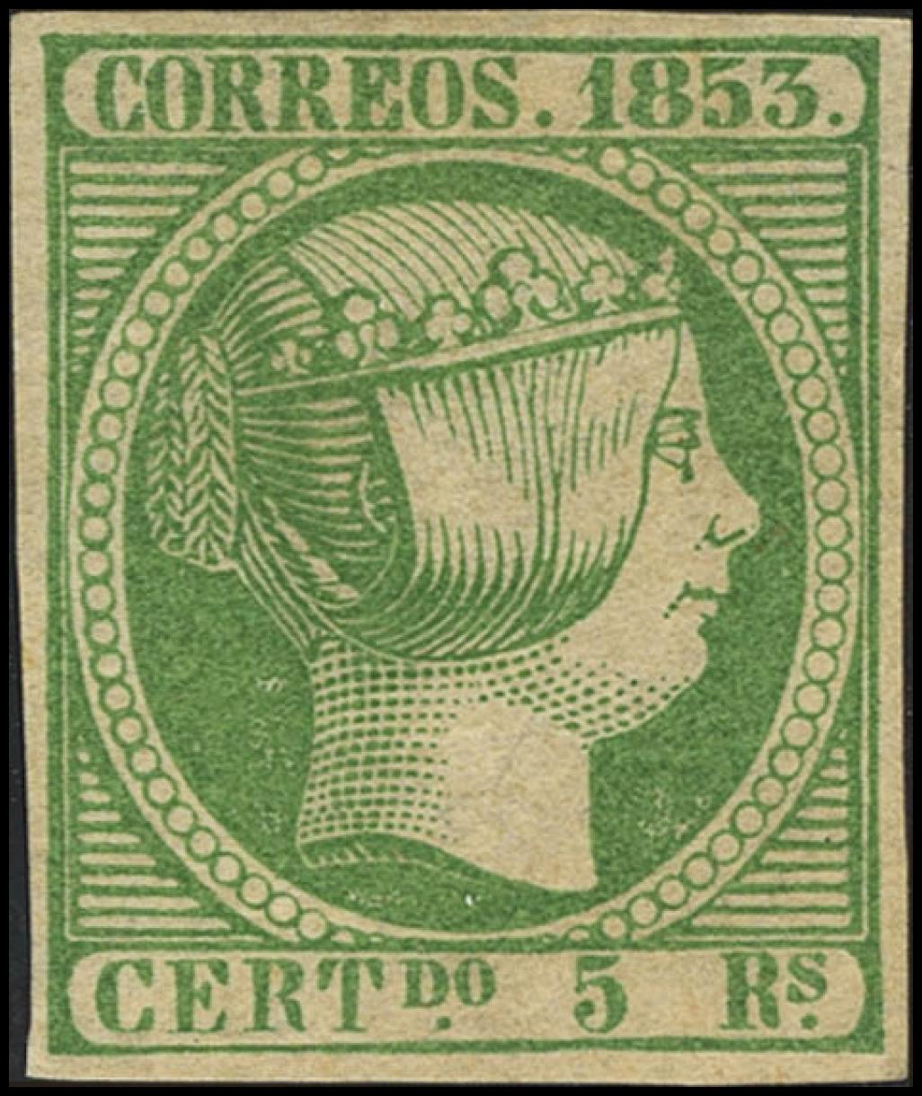 (★) 20. 1853. 5 reales verde. Color intenso y márgenes amplios. MAGNIFICO Y RARO EN ESTA CALIDAD. Cert. CEM.