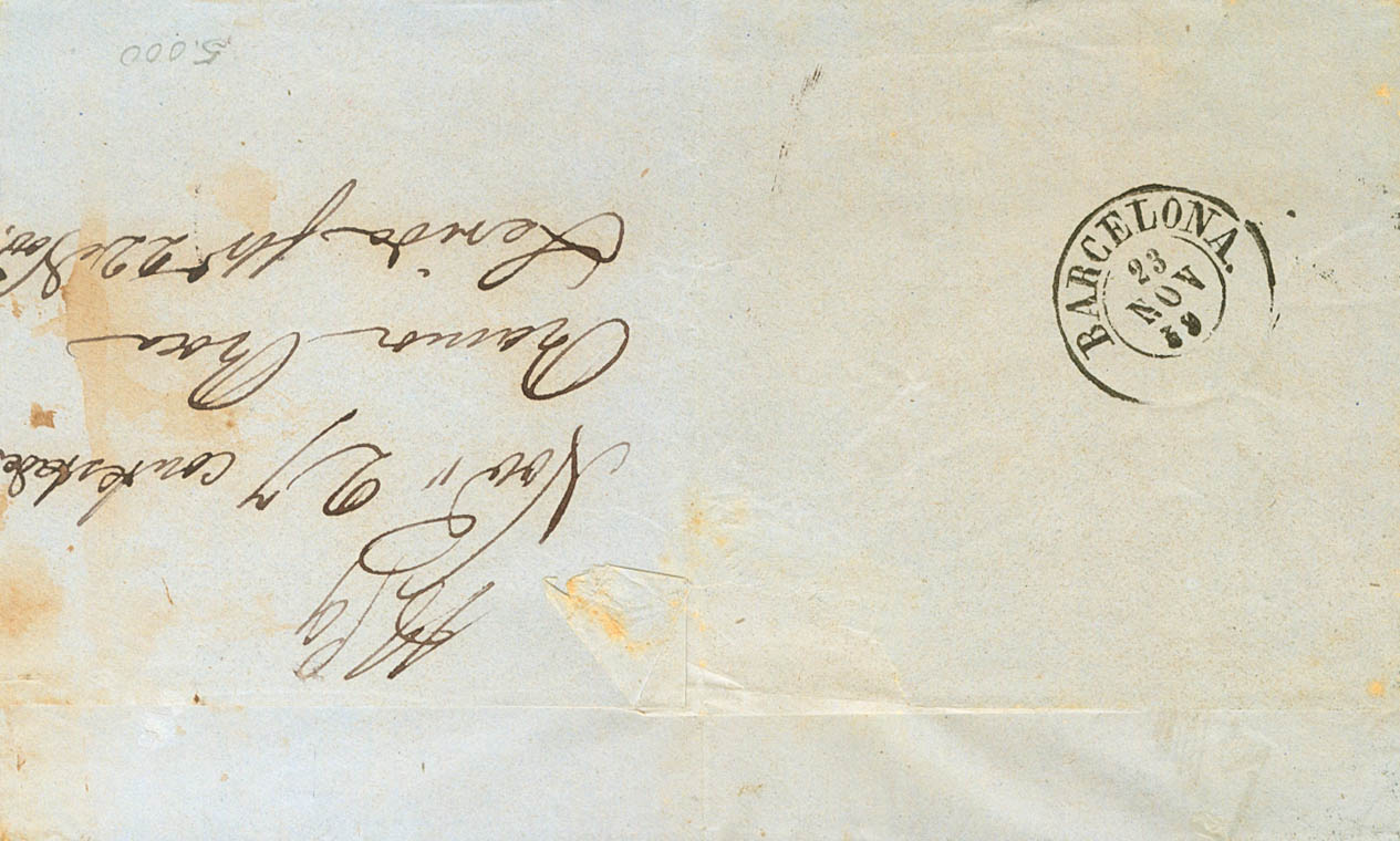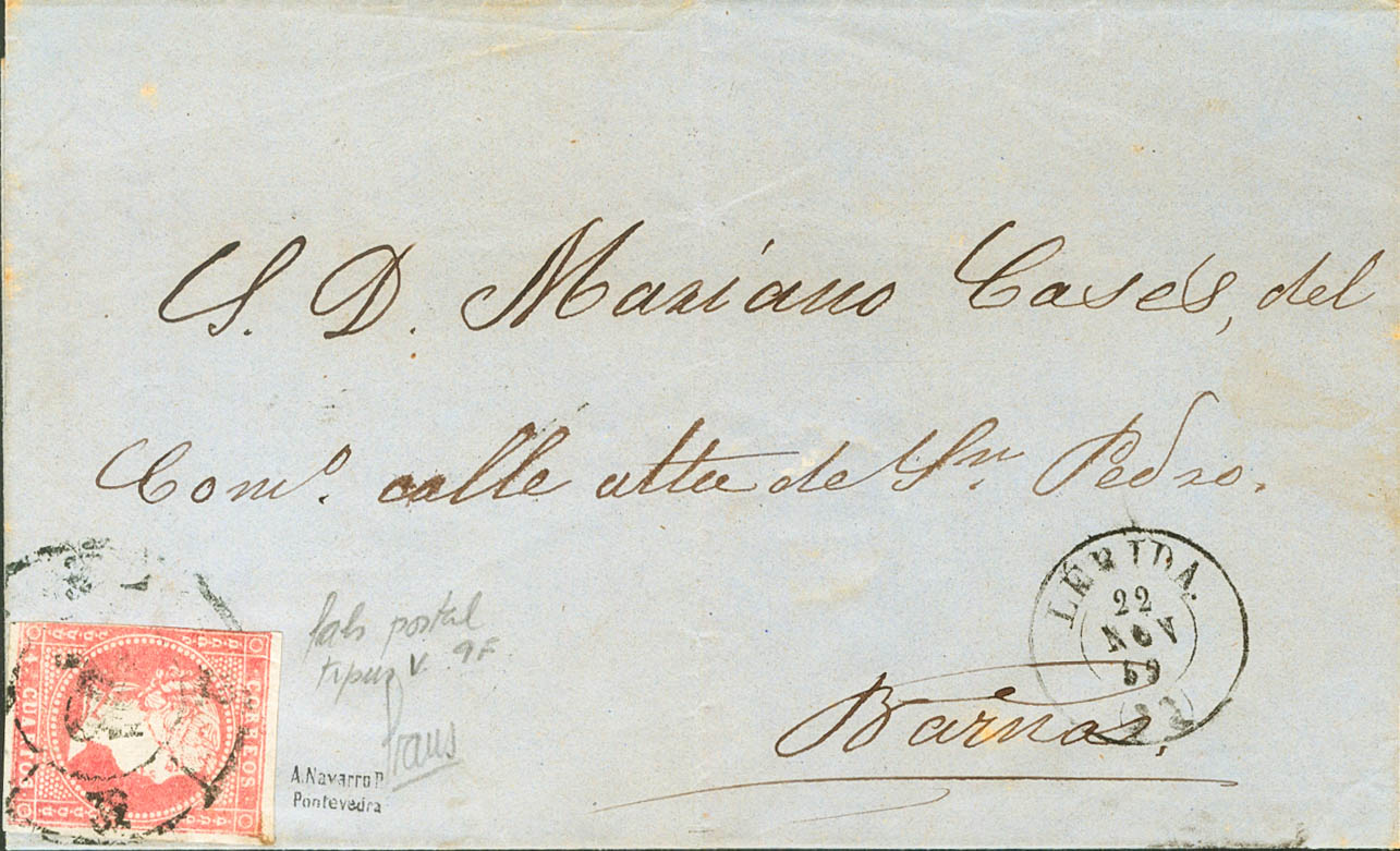 48F. 1859. 4 cuartos rojo FALSO POSTAL TIPO V. LERIDA a BARCELONA. Matasello R.CARRETA Nº32, de Lérida. MAGNIFICA Y RARA.