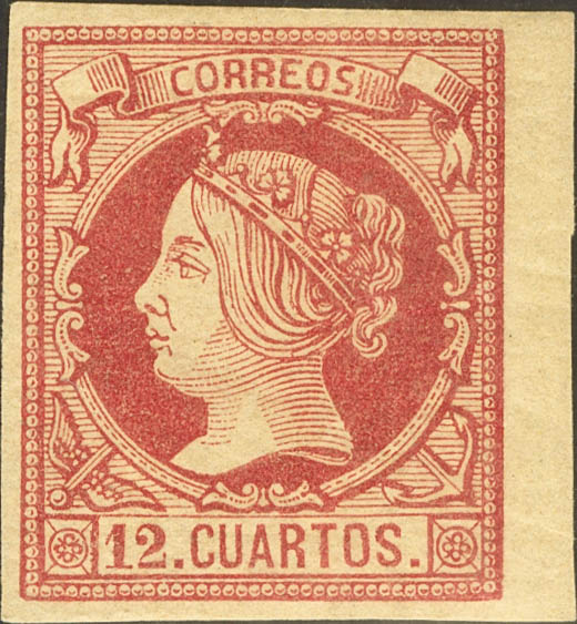 ★ 53. 1860. 12 cuartos carmÃn, borde de hoja. Márgenes grandes y color excepcional. PIEZA DE LUJO. Cert COMEX.