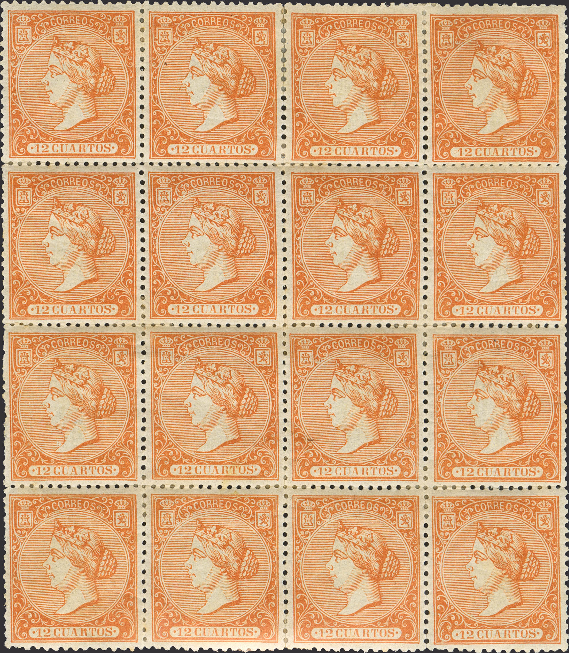 ★ 82(16). 1866. 12 cuartos naranja, bloque de doce. Excepcional centraje y color muy intenso. MAGNIFICA Y PIEZA DE GRAN ESPECTACULARIDAD, ESPECIALMENTE EN ESTA EXCEPCIONAL CALIDAD, SIN DUDA EL BLOQUE MAS GRANDE CONOCIDO DE ESTE SELLO EN NUEVO Y SIN DUDA UNA DE LAS PIEZAS CLAVES DE LA EMISION. Cert. GRAUS.