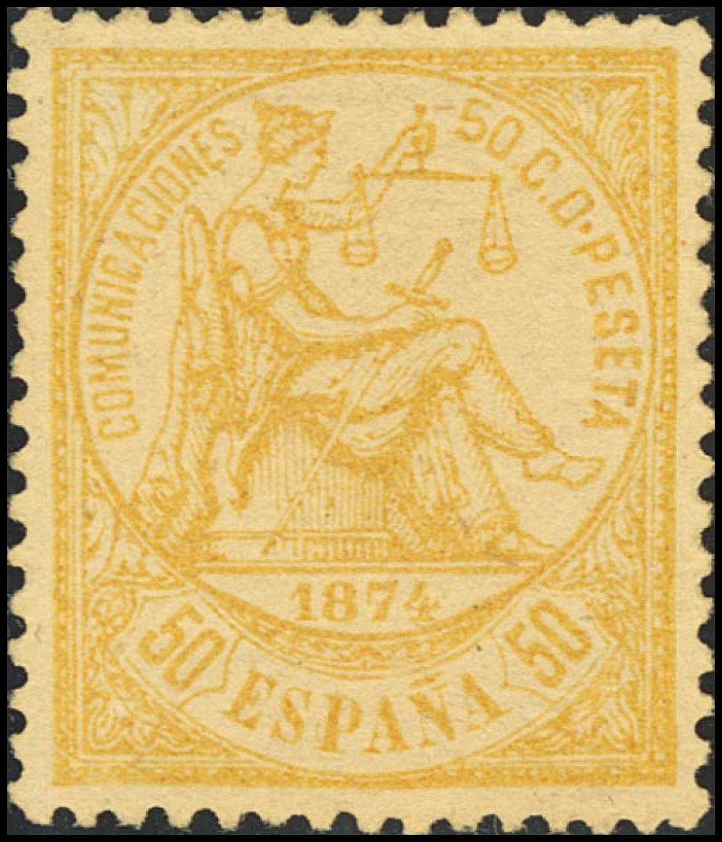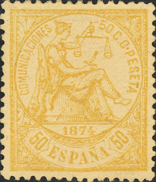 (★) 149. 1874. 50 cts amarillo. Centraje excepcional. PIEZA DE LUJO Y RARISIMO EN ESTA EXCEPCIONAL CALIDAD, UNO DE LOS SELLOS MAS RAROS DE LA EMISION EN BUENA CALIDAD. Cert. GRAUS.