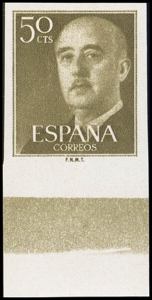 ★★ 1149s. 1955. 50 cts castaño oliva, borde de hoja. SIN DENTAR. PIEZA DE LUJO. Cert. CEM. Edifil 2025: +++1.100 Euros