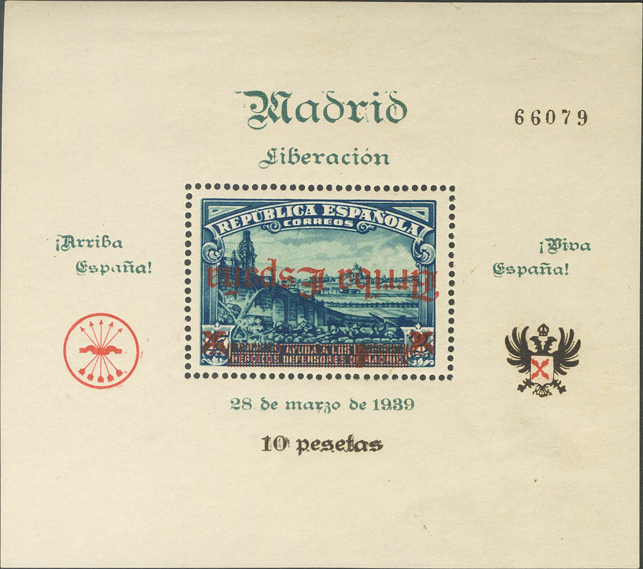★★ 54C. 1939. 10 pts sobre 45 cts + 2 pts azul, hoja bloque. Variedad SOBRECARGA "ARRIBA ESPAÑA" INVERTIDA. MAGNIFICA Y EXTRAORDINARIAMENTE RARA, ESPECIALMENTE EN ESTA EXCEPCIONAL CALIDAD, SOLO EXISTEN DIEZ HOJITAS. (Reguant 54D). Cert. CEM.