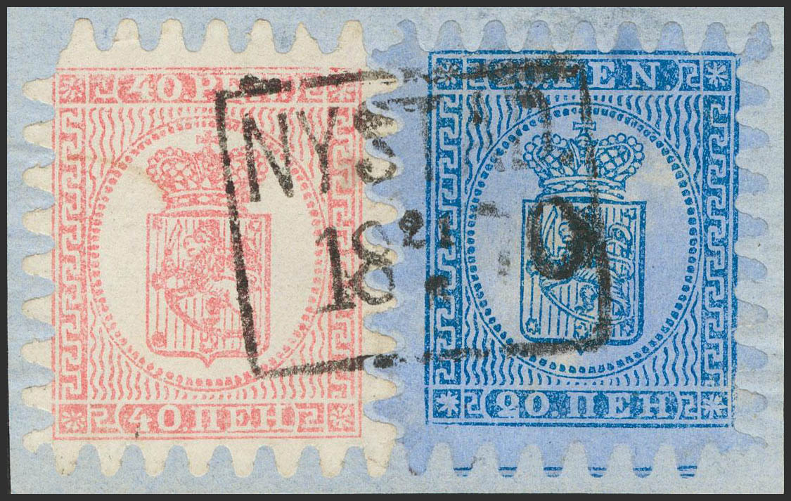 △Yvert 8, 9. 1866. 20 p. azul y 40 p. rosa, sobre fragmento. Matasello NYSTAD / 21-8-1870. MAGNIFICO.
